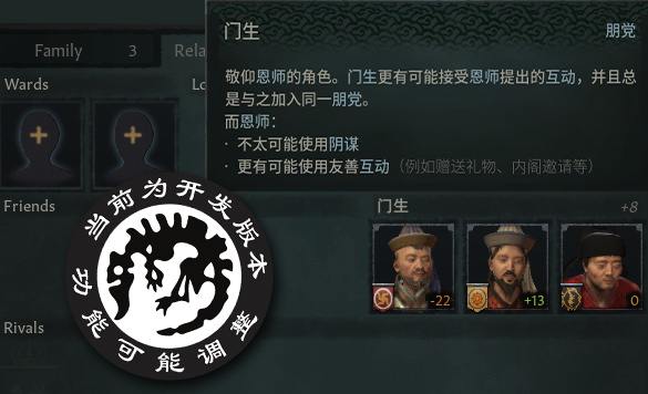 我们还添加了一种新的关系类型:恩师(Elder)与门生(Disciple),以进一步凸显社会联系和等级制度。这种关系与贤能挂钩,门生的贤能必须低于恩师,否则无法成功拜师或体面出师。获得门生的主要方式有两种:说服加入你的朋党,或通过新的政治计谋直接予以指导。门生还会将其朋党势力借给恩师。