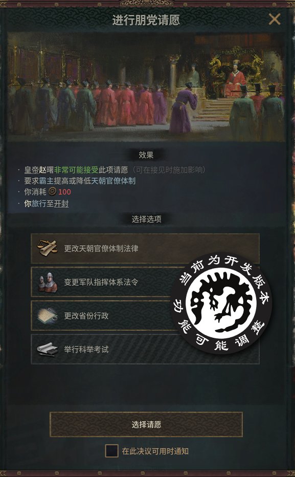 每个朋党都有一位领袖。朋党领袖可以与皇帝对接,并可通过决议发起独特的请愿,以推进其朋党目标或帮助其他成员。为了成为朋党领袖,你必须在其他成员面前证明自己,并在政治辩论中击败现任领袖。作为领袖,你可以参与另一种类型的辩论,即在皇帝面前,赢得皇帝的青睐,从而增强你所在的朋党的力量。这最终意味着拥有更强的牵引力和推动力,从而发展朋党并改变王朝兴衰时代。