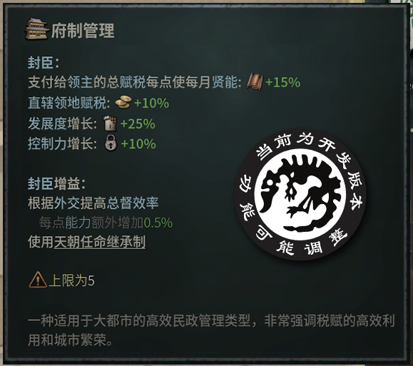 府(Metropolitan)注重高效的城市管理发展,不提供任何头衔兵士,仅能在王朝兴衰中的政通人和时代设立,并且可设立数量有限。