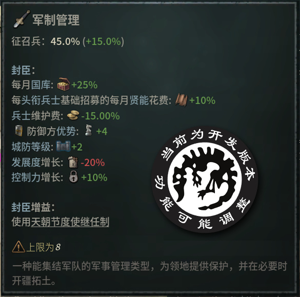 军(Military) 侧重于培养和维持头衔兵士与军事防卫能力,发展度增长受到限制,通常设立在边境地区。