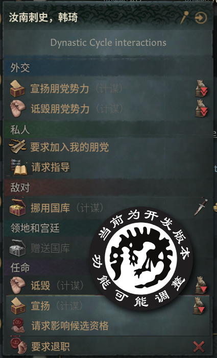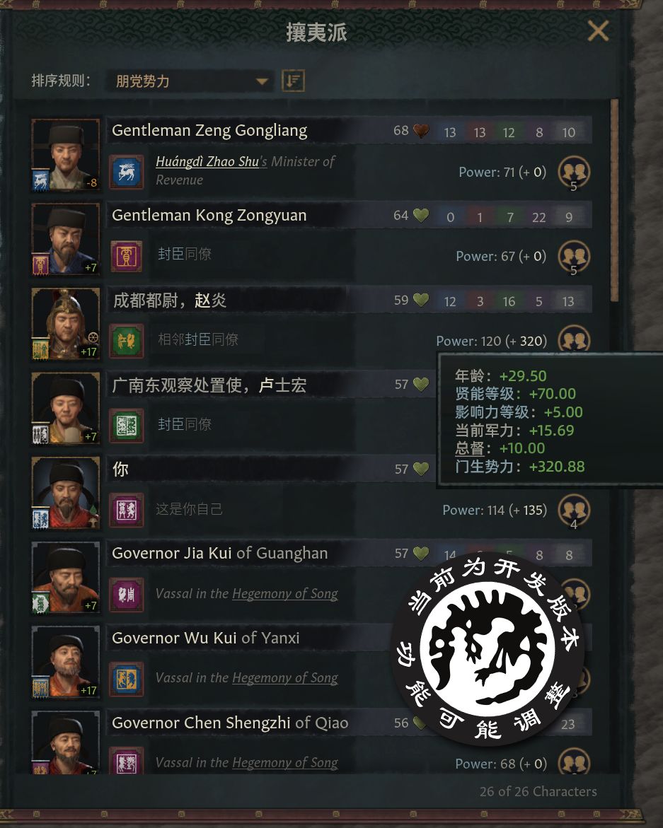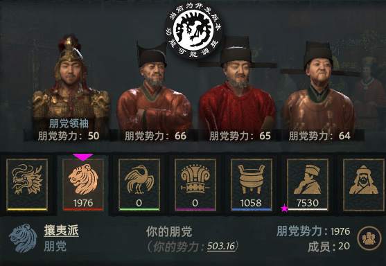 与拜占庭不同,中华的官员们可以分享超越个人目标的价值观。我们利用局势参与者群组功能,在王朝兴衰局势中创建了四种不同的朋党: