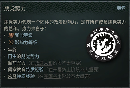 朋党的影响力体现在朋党势力(Movement Power)这一数值上,它是所有成员的个人朋党势力(Personal Movement Power)的总和。提升这一数值的方式多种多样,有些是永久性的(例如积累贤能、总督特质经验、年龄),有些是暂时性的(例如政治计谋、军力、门生)。
