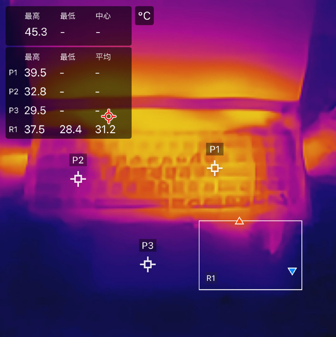 通过红外线检测,可以看到最高温集中在笔记本出风口下方,然后是左右两侧,笔记本键盘最高温度集中在右侧,ASDW键位保持清凉。同时触控板与掌托也保持清凉状态。