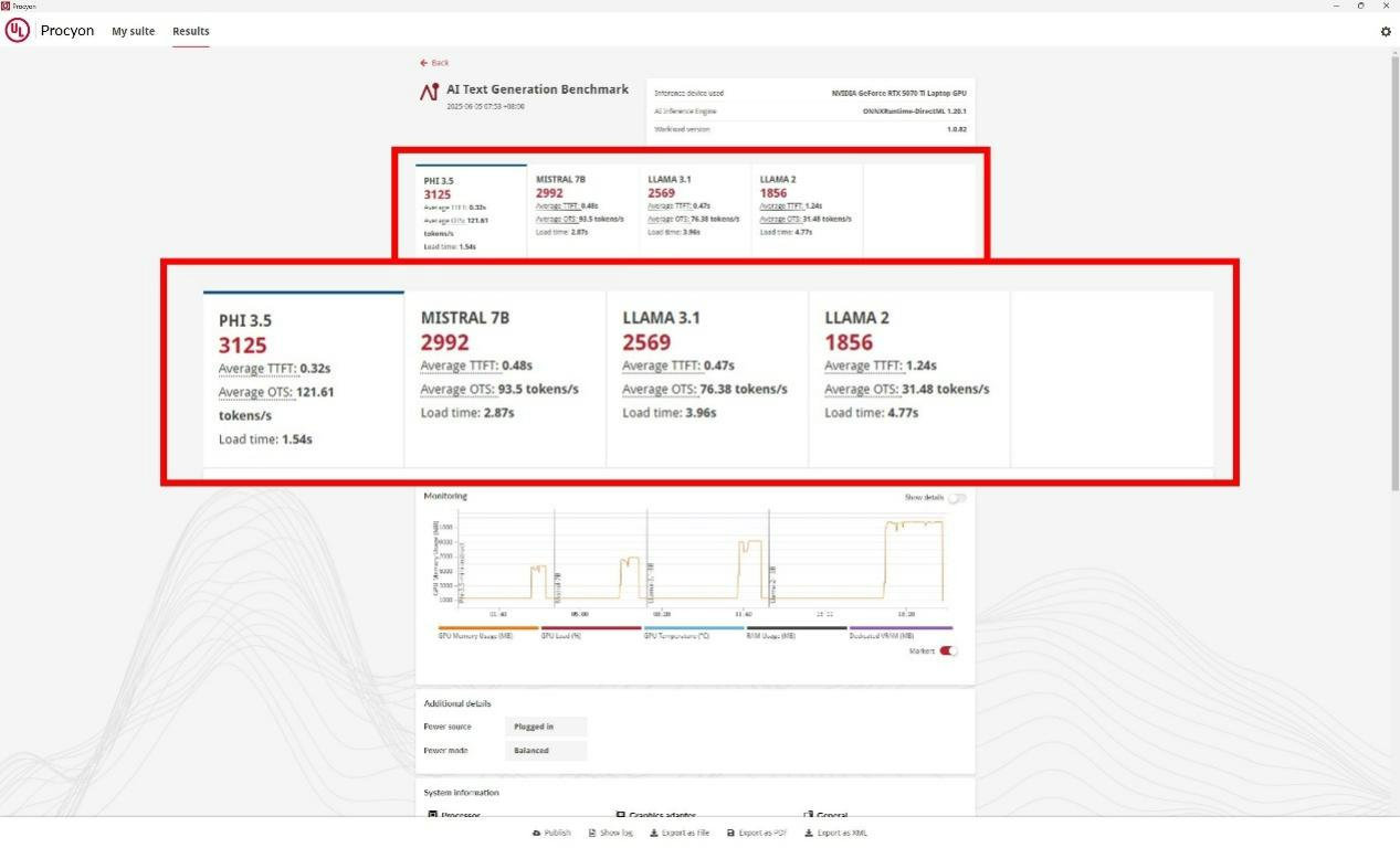 回到主题。这里先测试本地端的AI大模型运行情况,通过UL Procyon AI Text Generation Benchmark作为文字AI文本测试参考,在文本生成测试中包含了Phi-3.5-mini-3.8B,Mistral-7B-v0.2 7B,Llama -3.1 8B,Llama-2 13B。其中Phi-3.5-mini-3.8B达到了121.61 tonkens/s,对内存要求最高的Llama-2 13B也能做到31.48 tonkens/s。