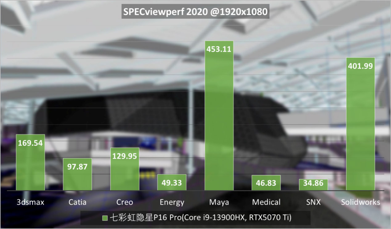 在依赖基础光栅性能的专业软件中,七彩虹隐星P16 Pro表现同样可圈可点,以专业软件SPECviewperf 2020为例,主要考验OpenGL和Direct X API的3D图形性能,测试场景包括3dsmax、Catia、Creo、Energy、Maya、Medical、SNX、Solidworks。可以看到,七彩虹隐星P16 Pro已经可以流的应对专业应用。