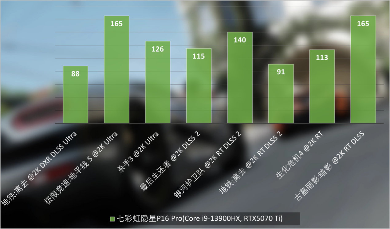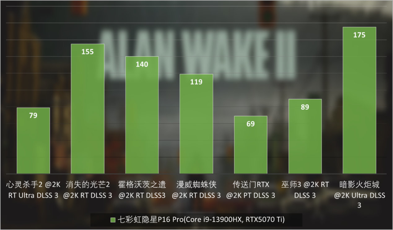 这样的势头延续到了常规游戏测试环节。可以看到GeForce RTX 5070 Ti Laptop GPU可以很好的发挥出七彩虹隐星P16 Pro的2.5K 240Hz屏幕的优势,在DLSS到DLSS 3的主流游戏环境中,已经可以让游戏在2K最高光追画质下,轻松运行在100FPS以上。