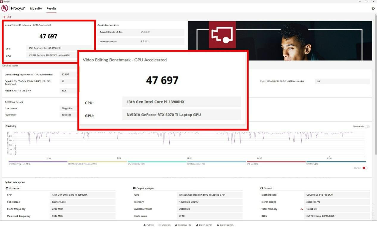 得益于32线程CPU和RTX 50系列Laptop GPU的优势,七彩虹隐星P16 Pro的优势同样可以延续到内容创作与AI上,一方面得益于GPU拥有12GB GDDR7显存,另一方面则是可扩容至32GB DDR5甚至更高容量内存,以及2个PCIe 4.0 M.2 SSD作为缓存支持,都可以成为笔记本流畅运行AI应用与内容创作的加分项。