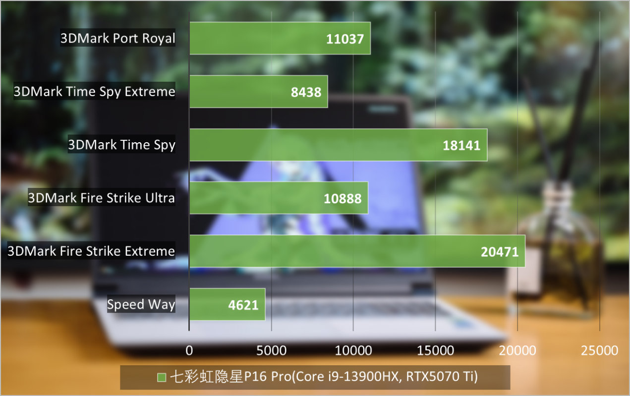 这意味着如果只依靠基础光栅性能,GeForce RTX 5070 Ti Laptop GPU已经展现出了很强的实力。在3DMark Speed Way、3DMark Fire Strike Extreme、3DMark Fire Strike Ultra、3DMark Time Spy、3DMark Time Spy Extreme、3DMark Port Royal多个项目测试中,不仅可以看到GPU得到了充足的性能释放,并且对比上一代GPU成绩明显提升,并且不输于使用最新处理器的游戏本。