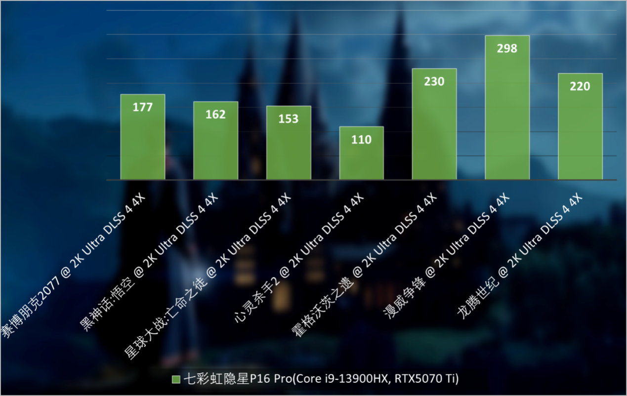 因此在DLSS 4游戏测试中,七彩虹隐星P16 Pro让GeForce RTX 5070 Ti Laptop GPU拥有很不错的表现,例如《漫威争锋》在2K最高画质下,开启DLSS 4 4X可以接近300FPS,《赛博朋克2077》2K最高光追画质则可以达到170FPS以上,《黑神话:悟空》2K光追最高画质也可以做到160FPS,这都是非常夸张的。