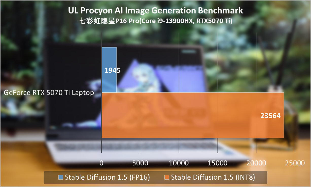 文生图方面,通过Procyon的AI Image Generation Benchmark Stable Diffusion 1.5 FP16与INT8,七彩虹隐星P16 Pro可以做到3.213 s/image和1.362 s/image,速度已经是同级GPU中前列水平,可见这个部分CPU性能对GPU AI运算不会造成妨碍。