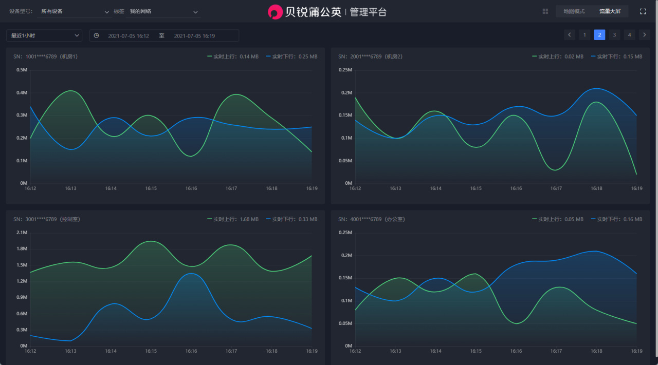 除此之外,流量大屏支持像监控一样查看各个设备的流量波动情况,且这个监看为实时状态。