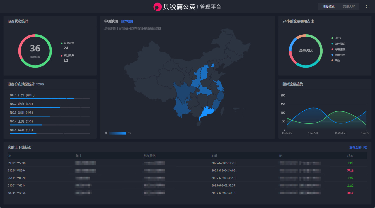 组网之后,蒲公英提供了监控大屏供用户查看,通过监控大屏能实时了解当前组网成员的分区情况、在线状态、流量占比等等,获取实时的链路告警。