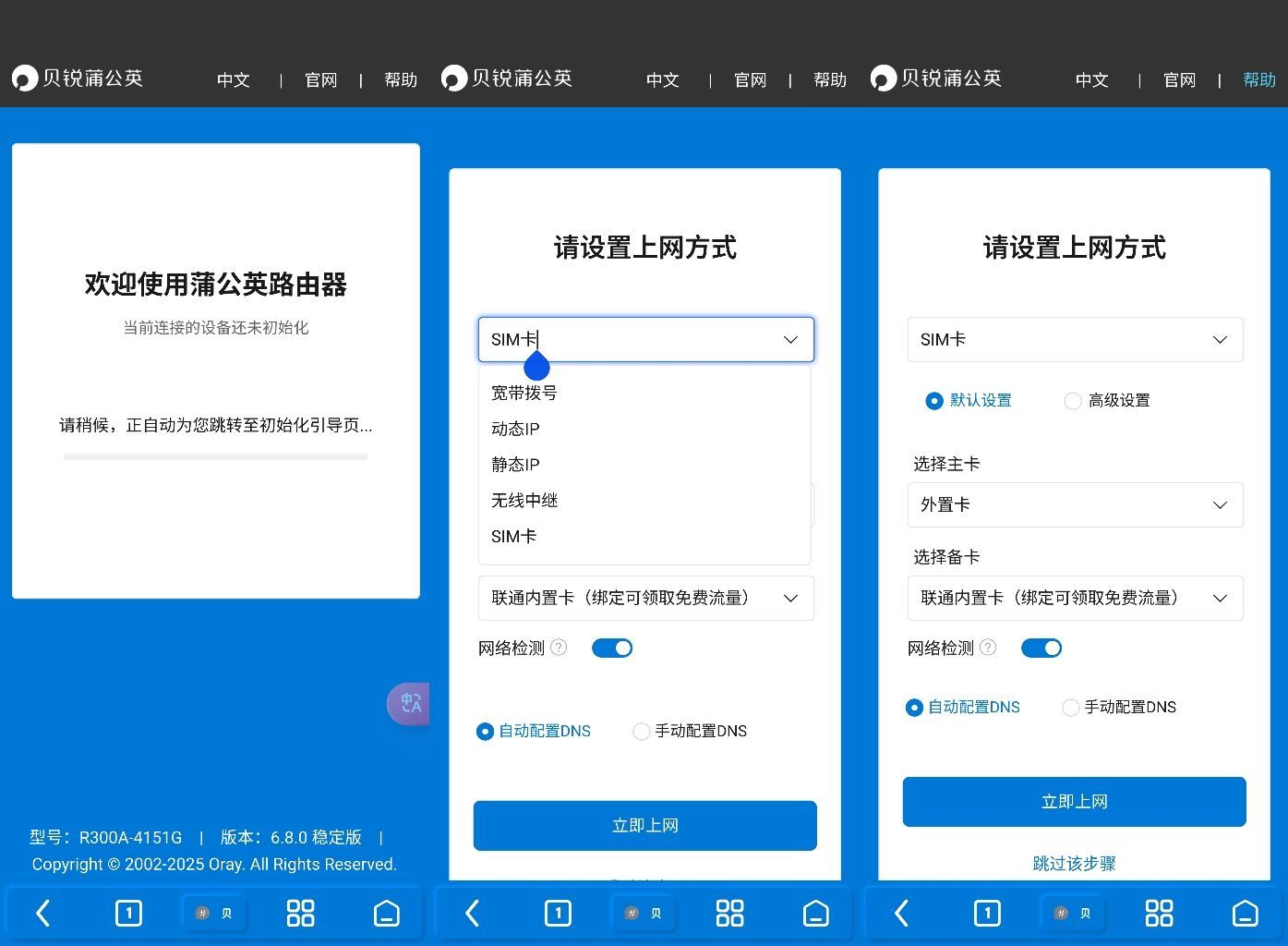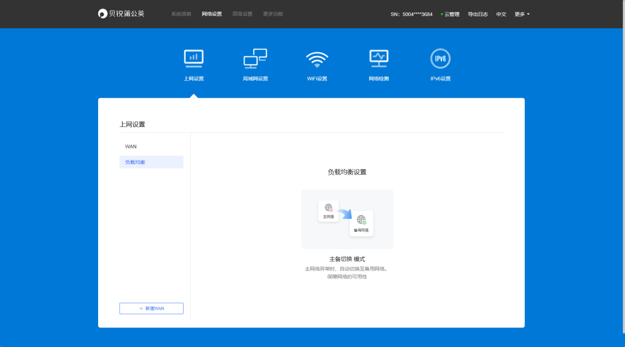 路由器默认的网关为10.168.1.1,在上网方式这里能看到,除了常规路由器支持的方式还多了个SIM卡,而SIM又提供了外置卡和内置卡两种主备方案,主备能实现负载均衡设置。