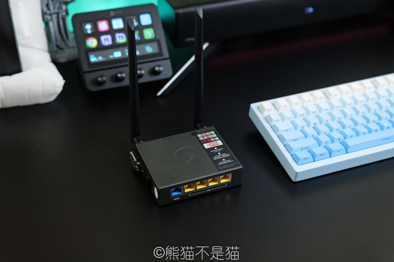 安装好天线、接上电源后,路由器会自动启动,机身本身没有配备电源开关,供电方面使用的是12V 1A的适配器。如果有Type-C升压线,那么也能实现DC转USB-C接口,这样也能用C口给设备供电了。