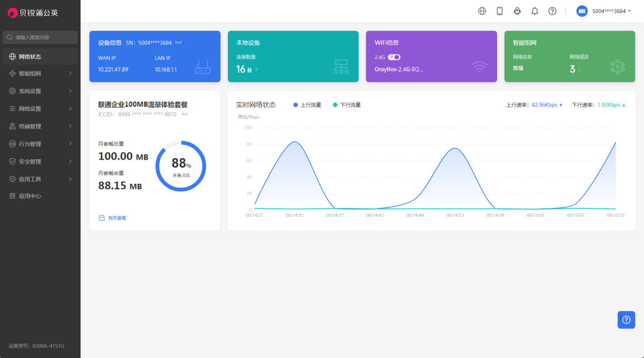 在蒲公英的设备管理中,能看到更为详细的信息,例如当前的SIM卡流量套餐、网络上下行状态、本地连接设备等等。