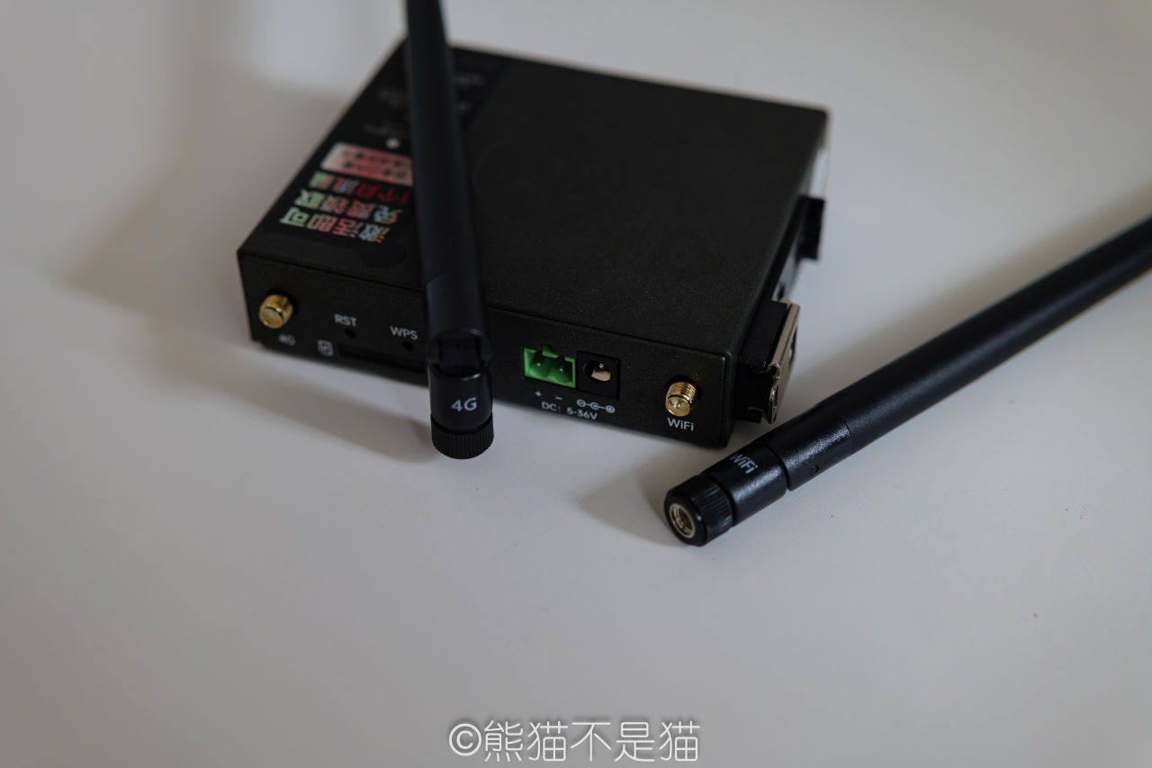 路由器顶部除了SIM卡槽,还配备了地线接口、WPS/Reset按键、供电端子以及电源接口。机身两侧则是天线部分,天线上分别印有“4G”和“Wi-Fi”字样,在安装时也要注意对应位置,别装错了。