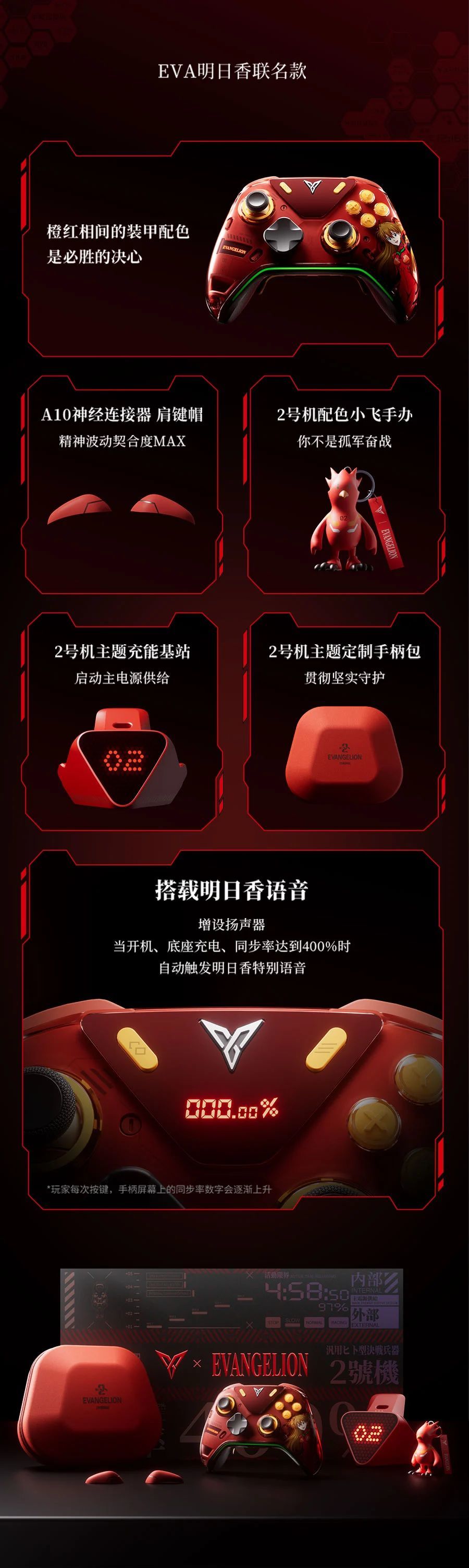 EVA明日香联名款:信仰加持,收藏必备 此次飞智还重磅推出与EVA合作的明日香(Asuka)主题限定手柄,全红装甲配色搭配标志性元素,致敬经典,信仰拉满。联名礼盒内含多种周边:明日香语音系统、2号机主题充电基站、专属手柄包、Q版手办等,全面提升收藏价值与使用体验。