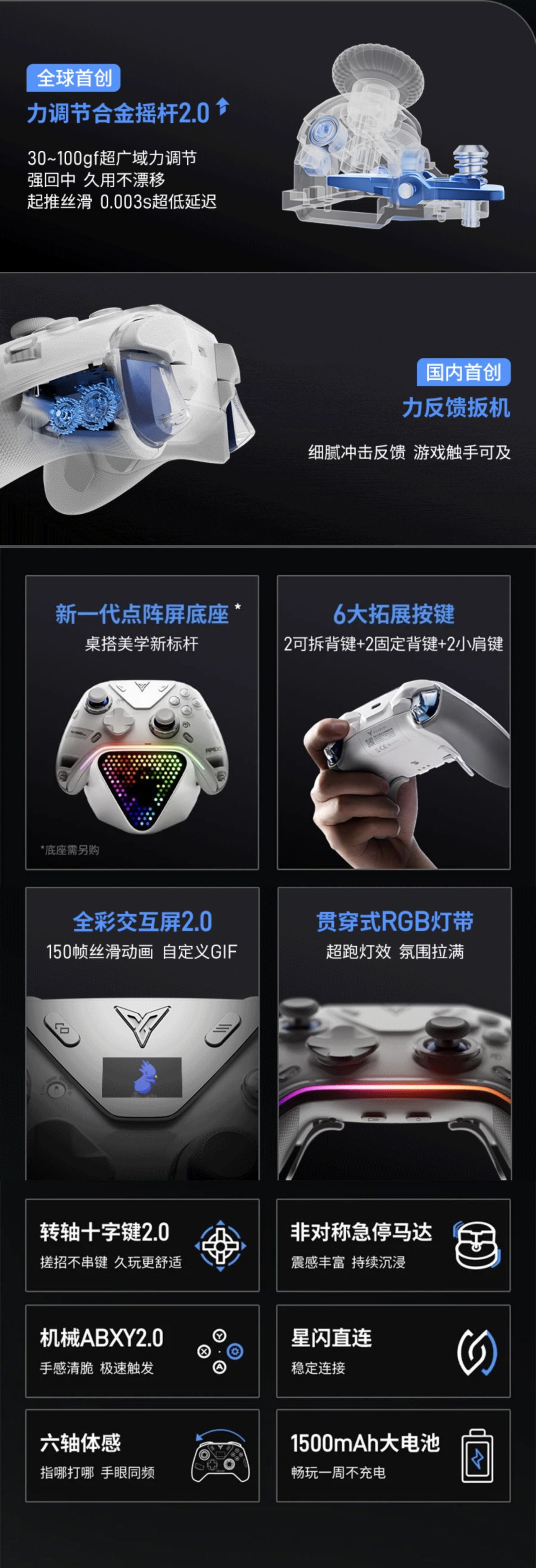 全球首创力调节合金摇杆2.0,手感精准升级 飞智在操控体验方面同样精益求精。本次全新手柄搭载了全球首创的「力调节合金摇杆2.0」,支持30~100g范围超广力度调节,具备极高回正精度与0.003秒级超低延迟响应,即便是高强度竞技操作也游刃有余。 配合国内首创的「力反馈板机」,在射击与竞速类游戏中能感受到更加细腻真实的震动反馈,大幅提升沉浸感。