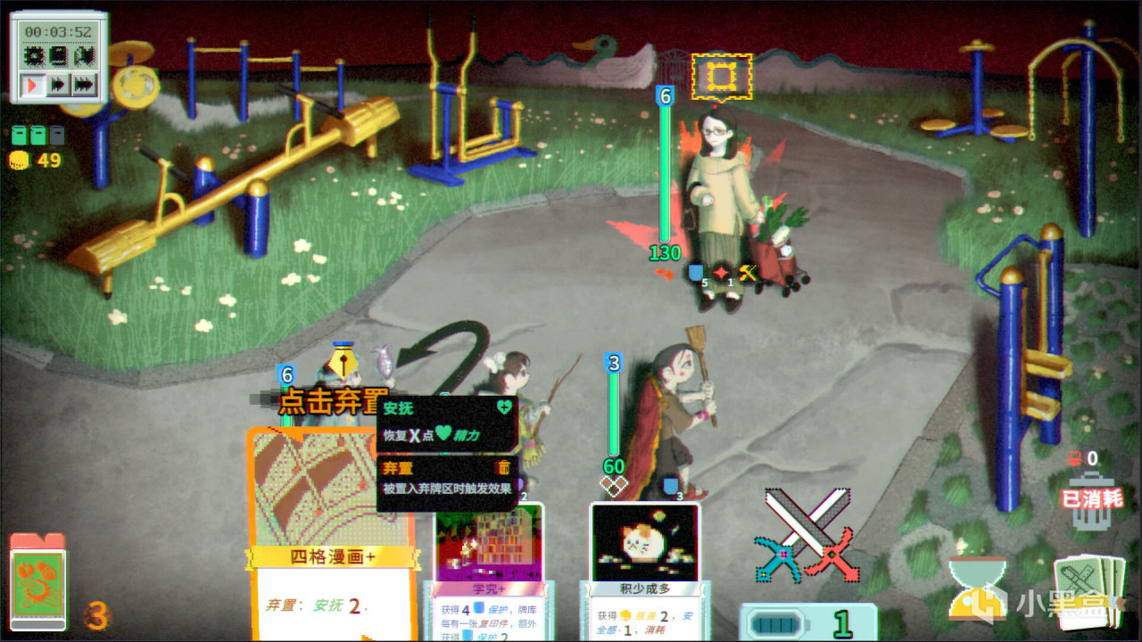 战斗方面则是回合制卡牌战斗,但加入一些反常规的玩法机制。例如,点击并非打牌而是弃置,充电可以获得额外的行动回合。用有限的弃牌点数,换到更合适的卡牌。