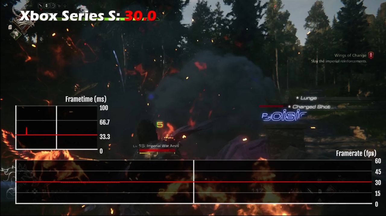根據 Twisted Voxel 引用 Digital Foundry 的技術分析,在 Xbox Series S 上,《最終幻想16》以單一模式運行並鎖定在 30 FPS,內部渲染分辨率約爲 792p。這種設置雖在畫面清晰度和環境細節,如植被密度和陰影質量上有所妥協,但在動態光影效果和大型召喚獸戰鬥場面中仍能保持流暢表現,讓這款大作在微軟入門級主機上意外地表現出色。