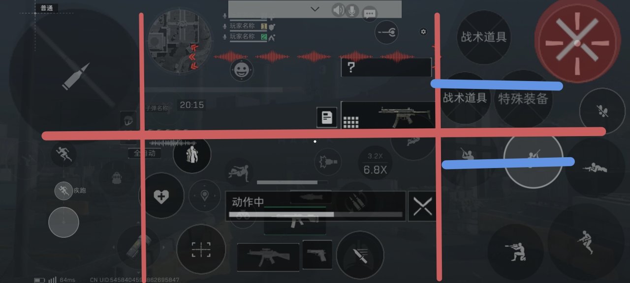 探头单独讲(因为有探头自动开镜这一辅助,所以四指用的好,可以相当于五指)如图蓝线的是探头可以放的位置。如果放上面就相当于用右手食指控制,放下面则用大姆指控制。推荐放上面,因为跳的同时可以探头开镜。而且探头对枪的可以站着探头拉出去,再下蹲。我本人由于第一个FPS手游不是洲老师,没有这辅助,并且我之前玩的FPS手游并不能跳的同时探头以及开镜。放下面也是有优势的。放上面一般是不推荐开探头可转向的。因为开了,镜头容易抖。探头对枪时,如果要下蹲,那大姆指在蹲键。所以更依靠陀螺仪(推荐开,纯手搓不好打。纯新手可以直接练,老登习惯了手搓玩不习惯就不开了)