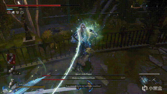 更让人拍手称绝的是双 BOSS 战“死亡控偶师玛奇奥娜”,她操控的人偶既是敌人也是弱点。玩家可击破人偶控制器,这样会使玛奇奥娜会因短路陷入硬直,主动打断节奏制造输出窗口。这场“双生之舞”将传统双 BOSS 战的混乱无序,转化为需要观察与博弈的轮换艺术,其设计思路甚至为类魂游戏提供了新解题范式。