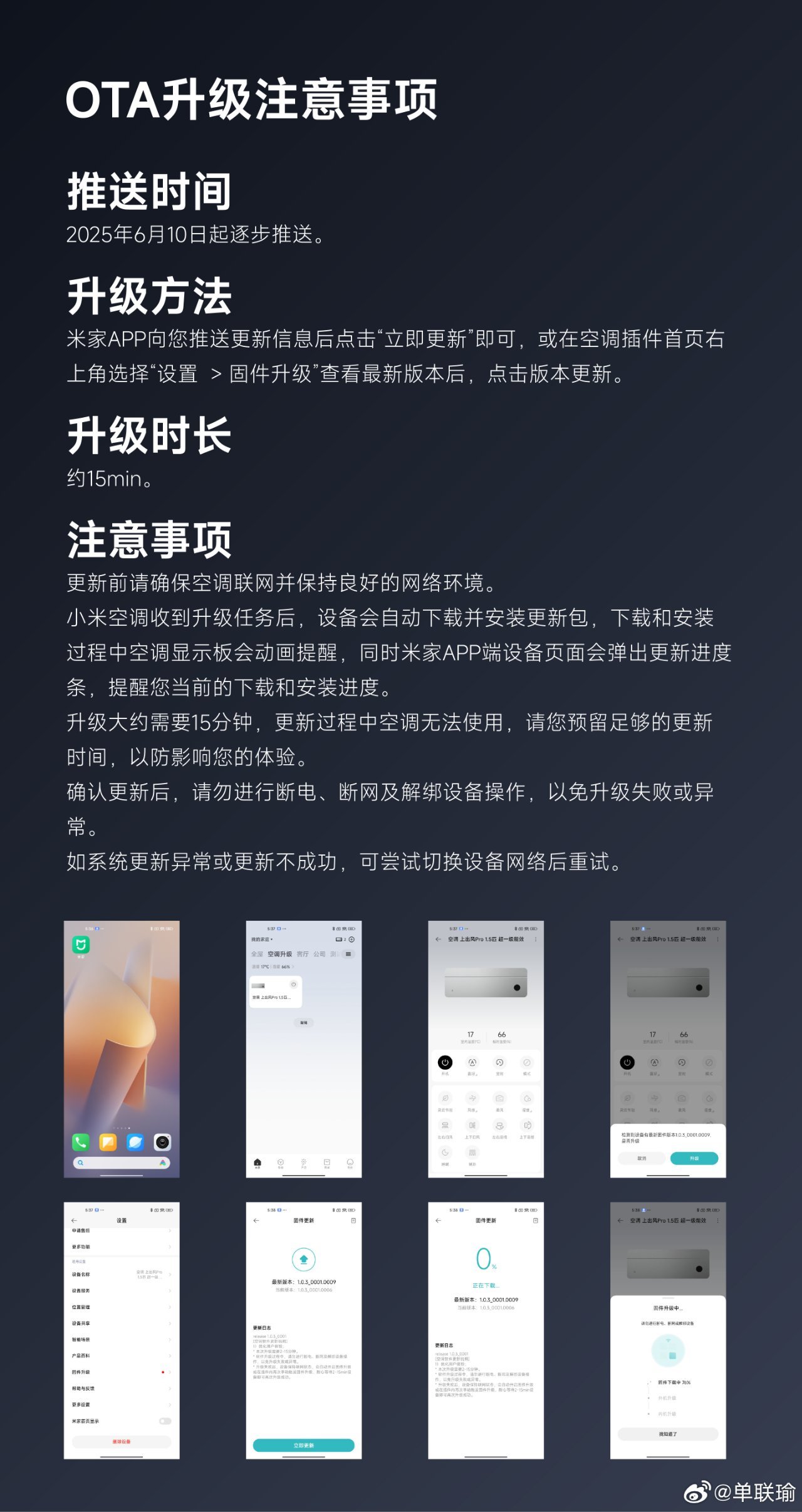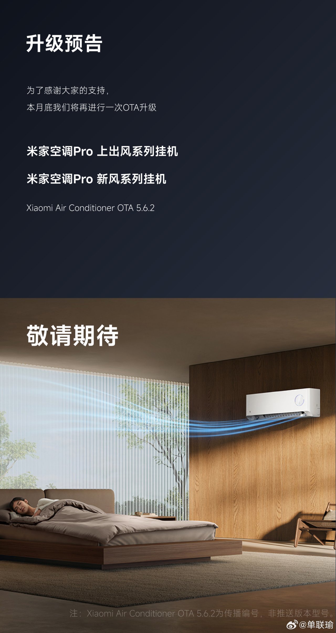 今日,米家空调Pro系列将于6月10日起陆续推送OTA更新,