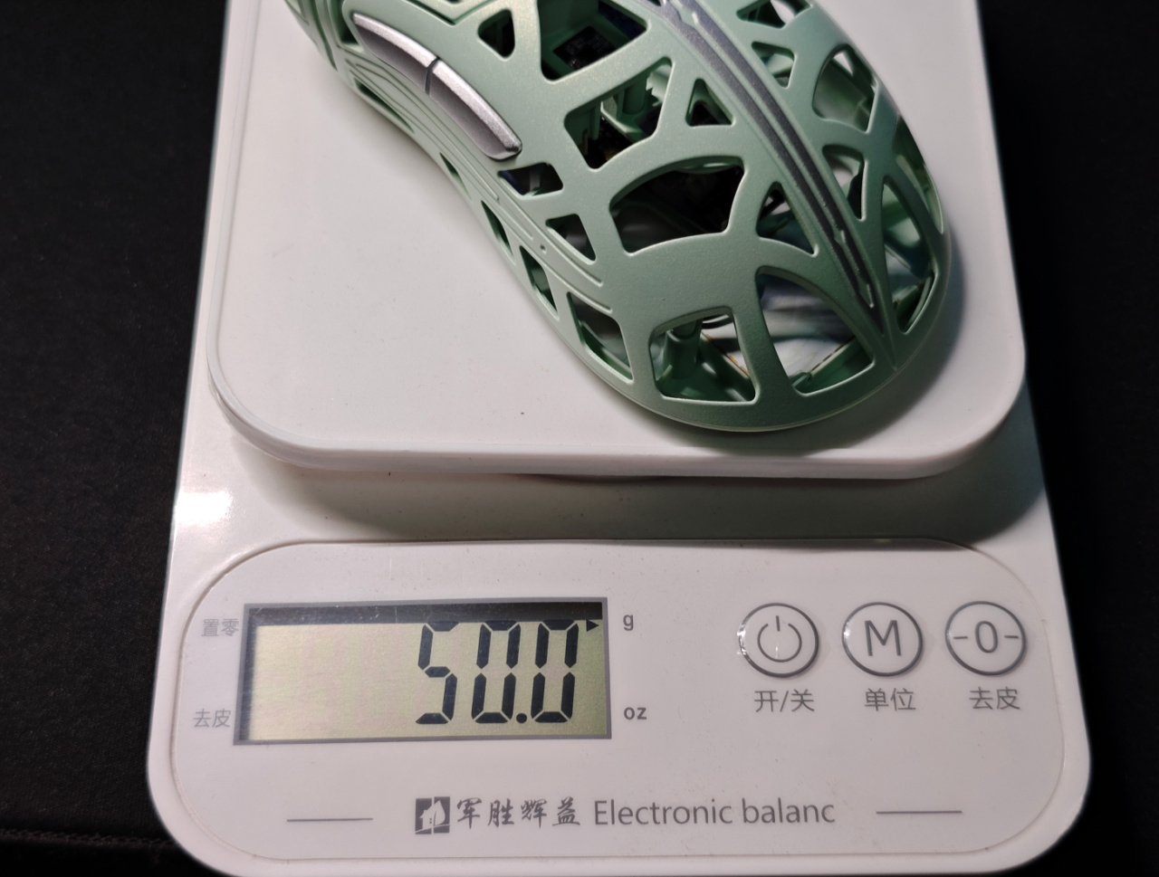 重量在50g整,作为镁铝合金打孔鼠标来说属于正常,但如果结合它中大手模具来看,几乎不太能达到50g整,这个重量确实发挥了镁铝合金的优势。鼠标有重量还是有优势的,太轻会打飘,反而控制不住。