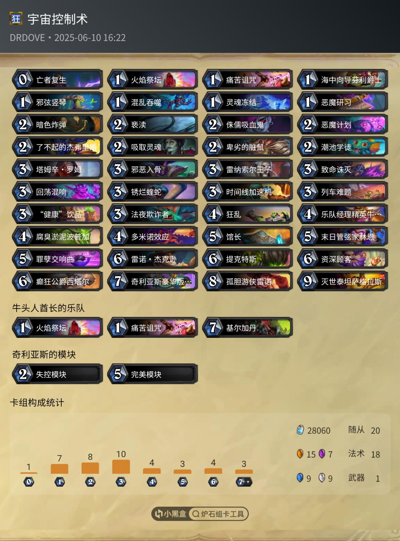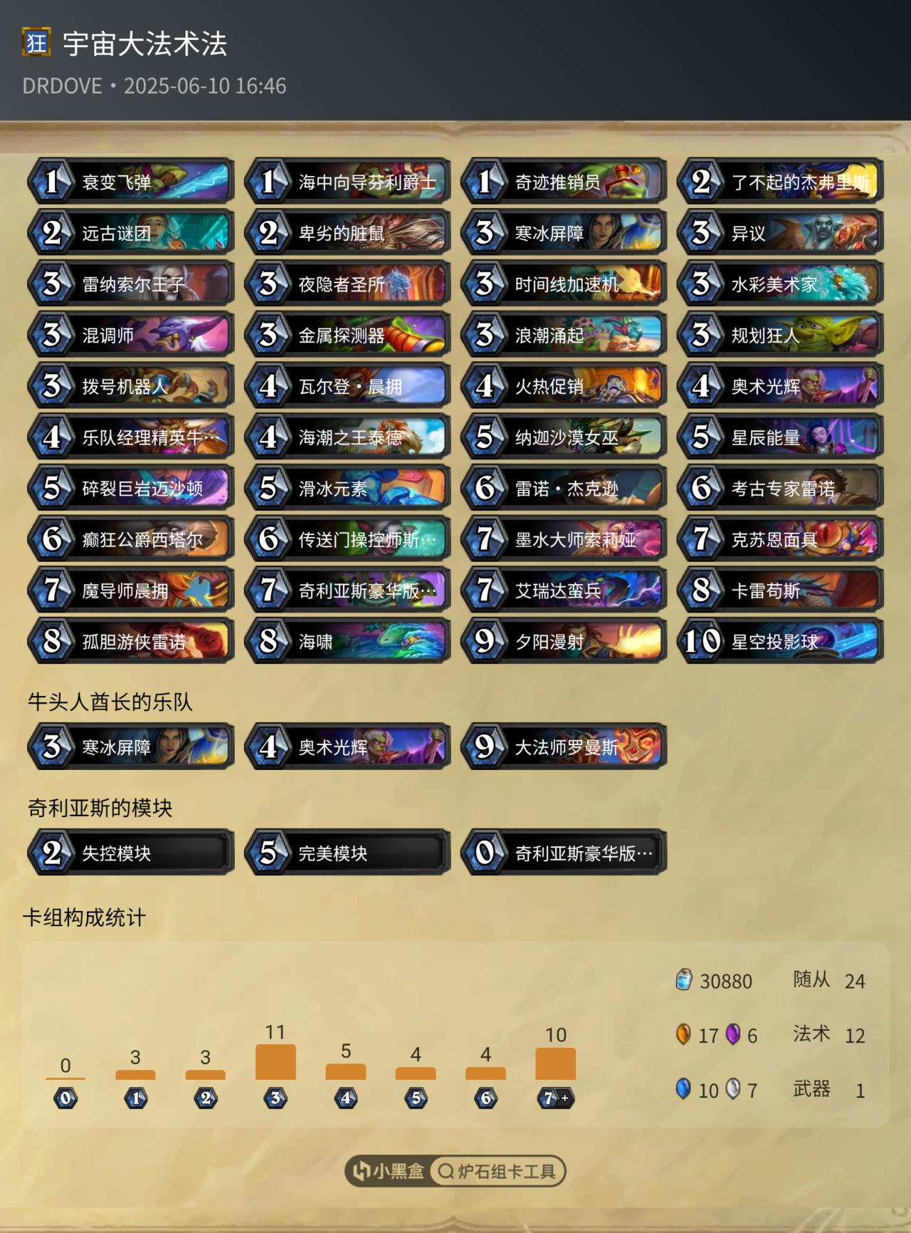 這裏列出的是我最近玩的比較多的幾套,從2016年入坑爐石以來,先是術士單職業,再到暗金教御三家,時至今日的全職業宇宙,可以說十年來我大部分的爐石時光都花費在宇宙身上了