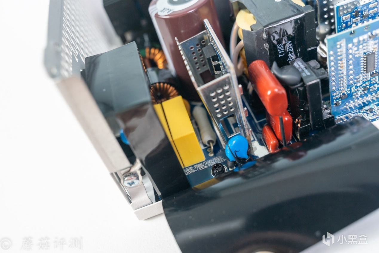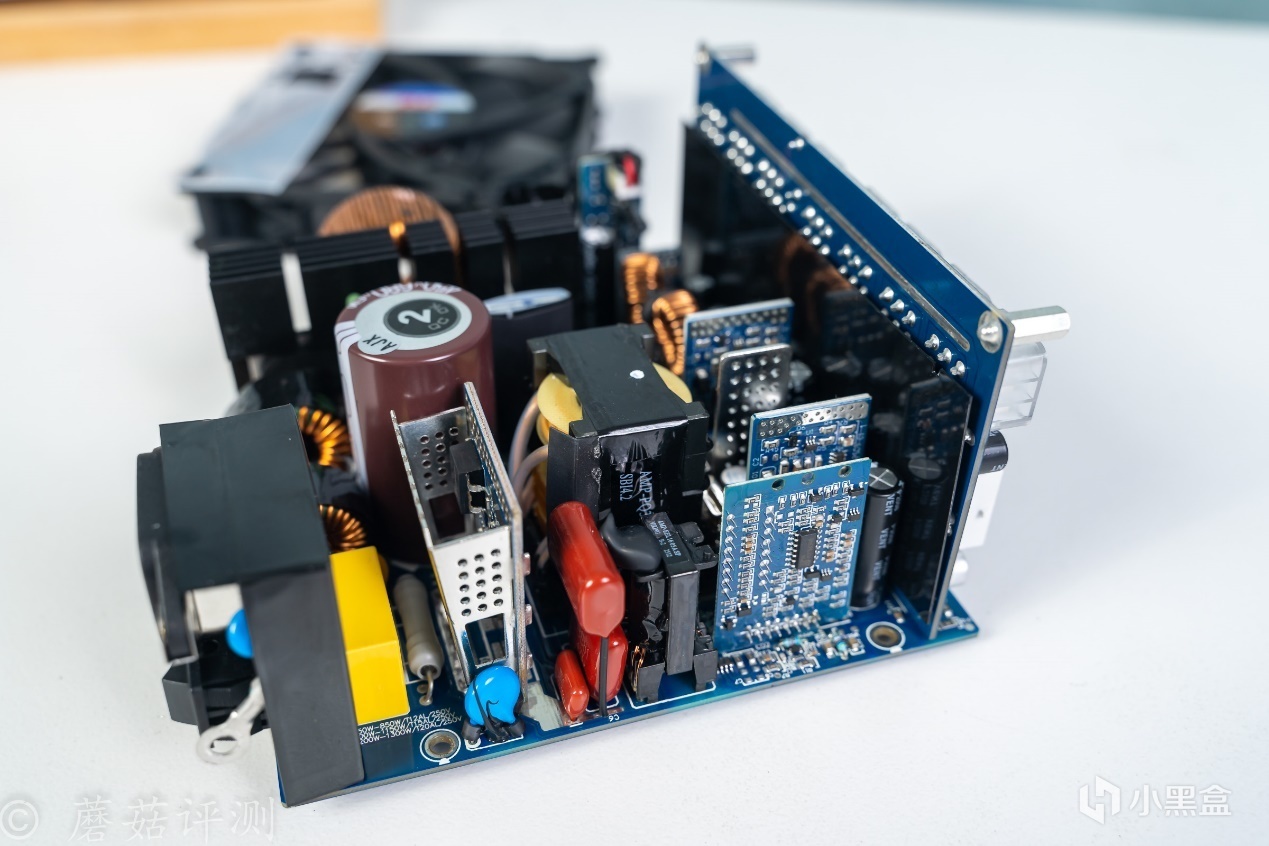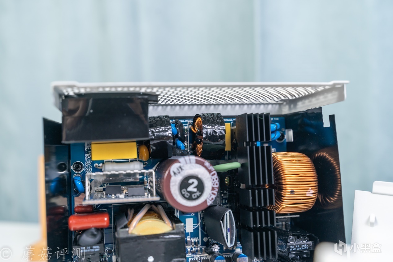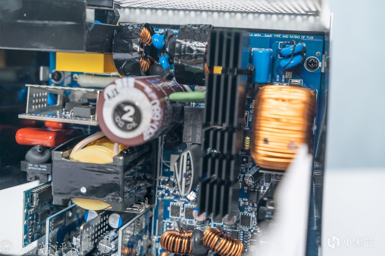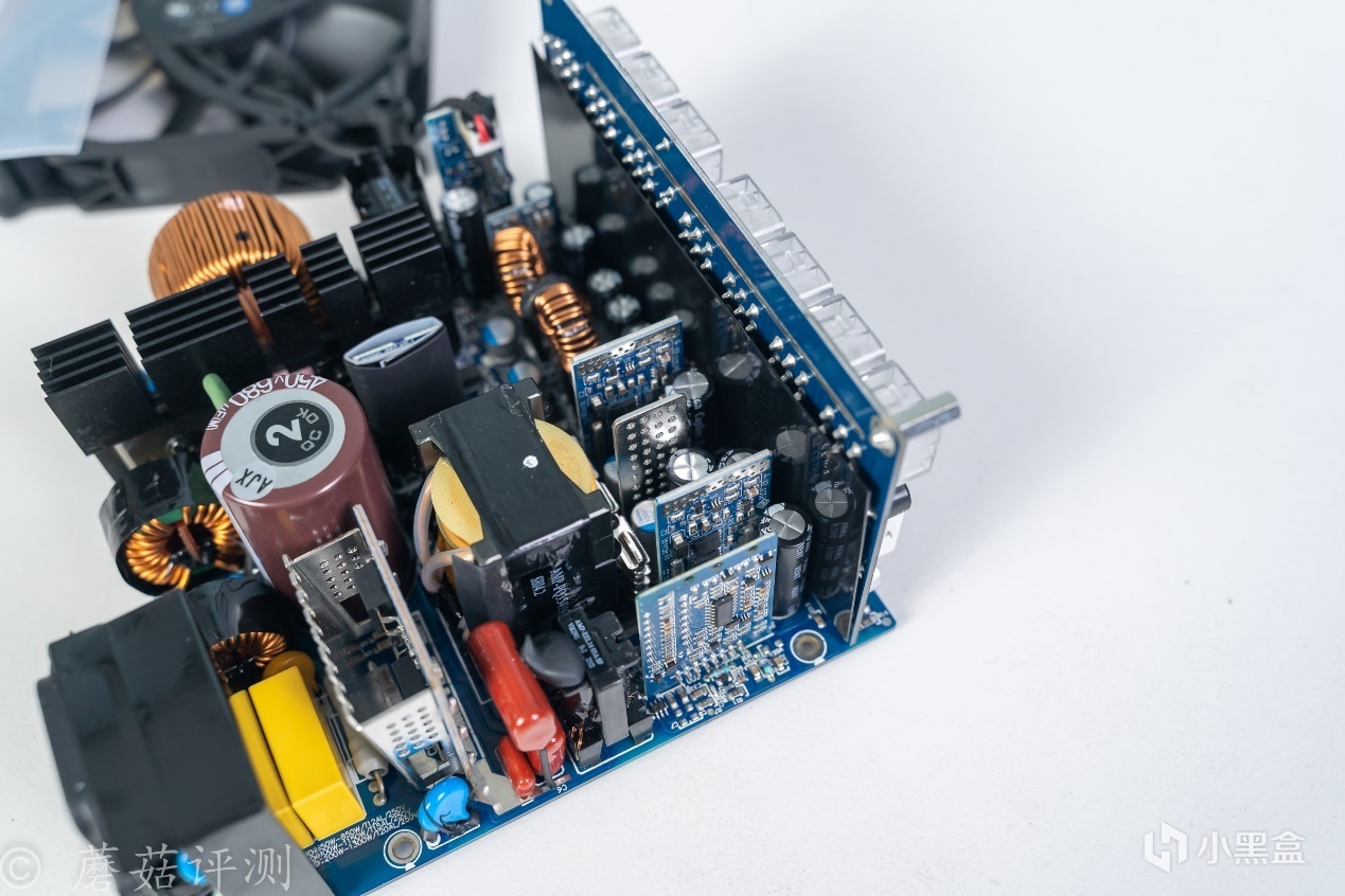 電源內部的結構很熟悉,主動PFC+半橋LLC+同步整流+DC-DC,主電容是日系NCC的,容量680μF,耐溫105℃,很不錯。不過電源內部的電路佈置很有意思,很經典的振華風格,LLC電路的管子沒有和PFC電路的管子並排,反而獨立放到主變壓器旁邊,不過相比較於之前的型號,其LLC的管子在散熱方面有加強。另外在電源的同步整流電路旁邊,有獨立的監控反饋電路,可以更好的檢測電源的輸出電壓,給出反饋的同時、還能提供更多的保護。