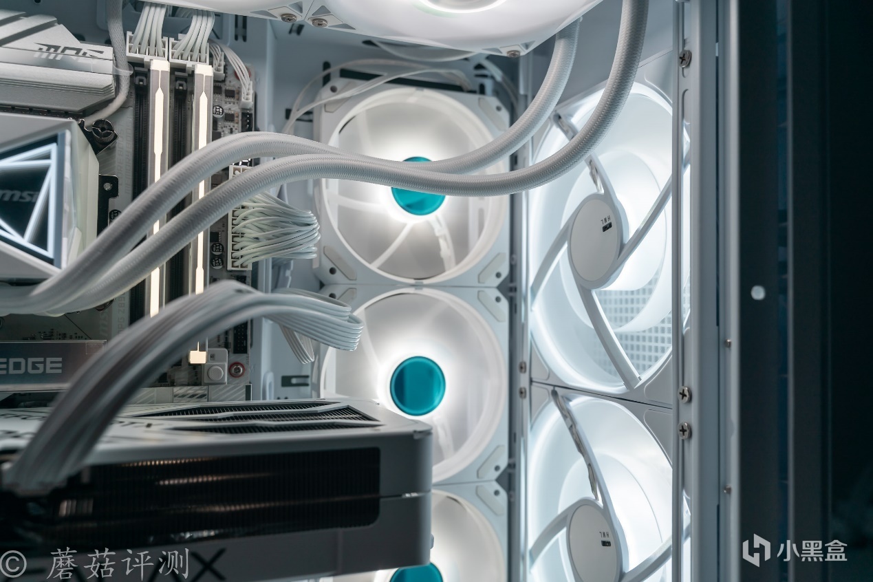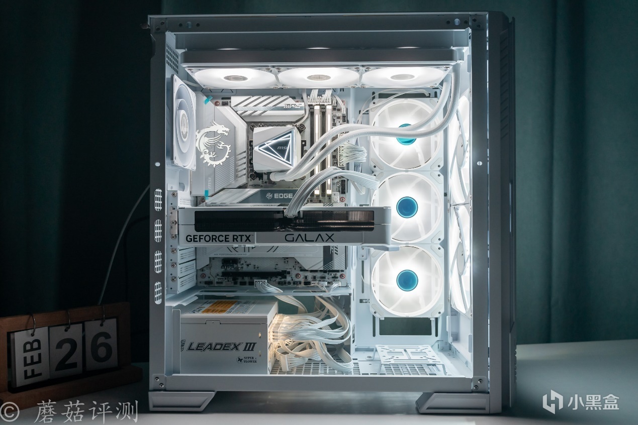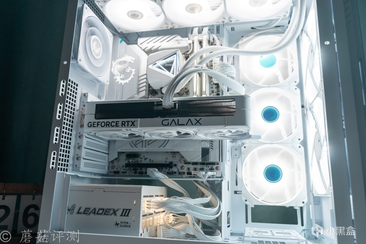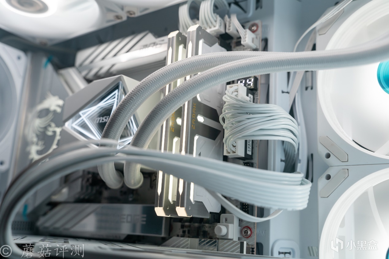 ▼蘑菇這裏準備了一套265K搭配RTX 5080顯卡的配置,整機硬件都是白色的,顏值很漂亮。