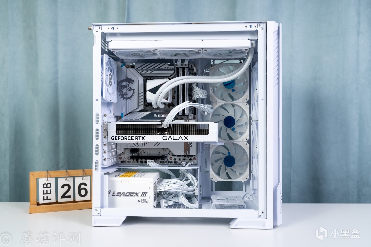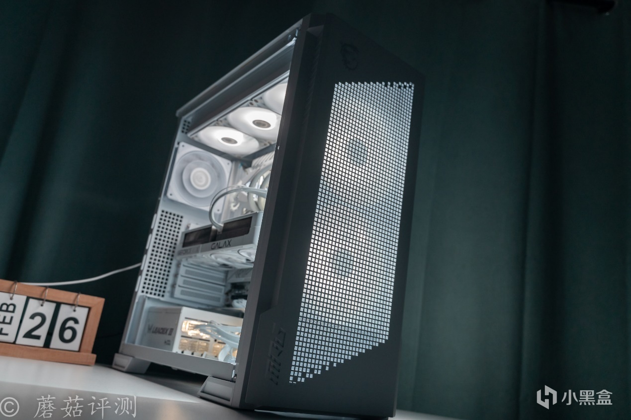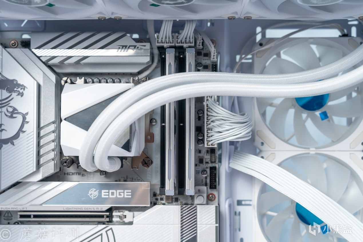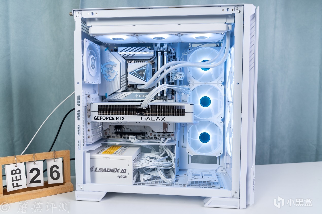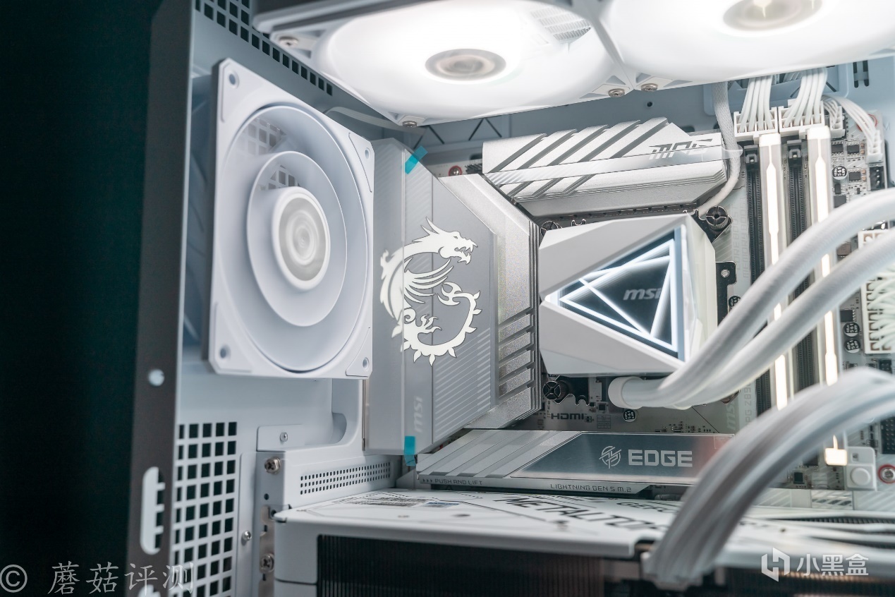 ▼蘑菇這裏準備了一套265K搭配RTX 5080顯卡的配置,整機硬件都是白色的,顏值很漂亮。