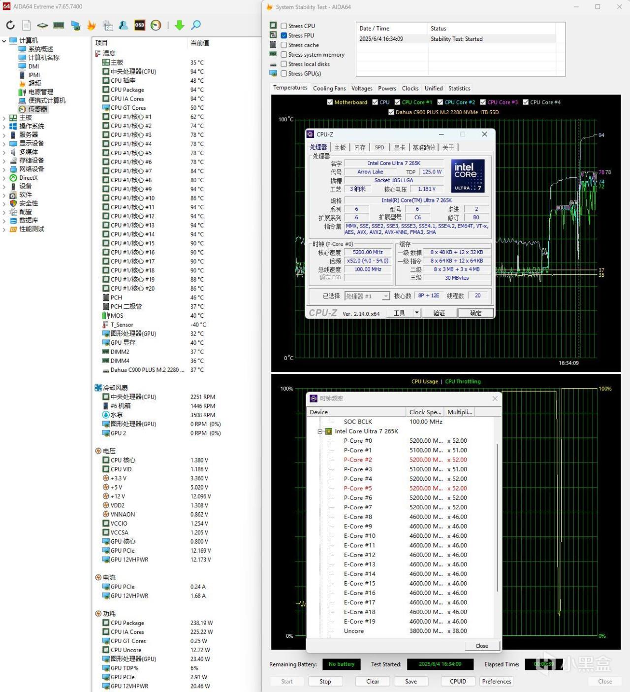 ▼單烤FPU測試,處理器功耗直接去到240W左右,大核心睿頻5.2GHz,小核心睿頻4.6GHz,溫度在94℃左右。