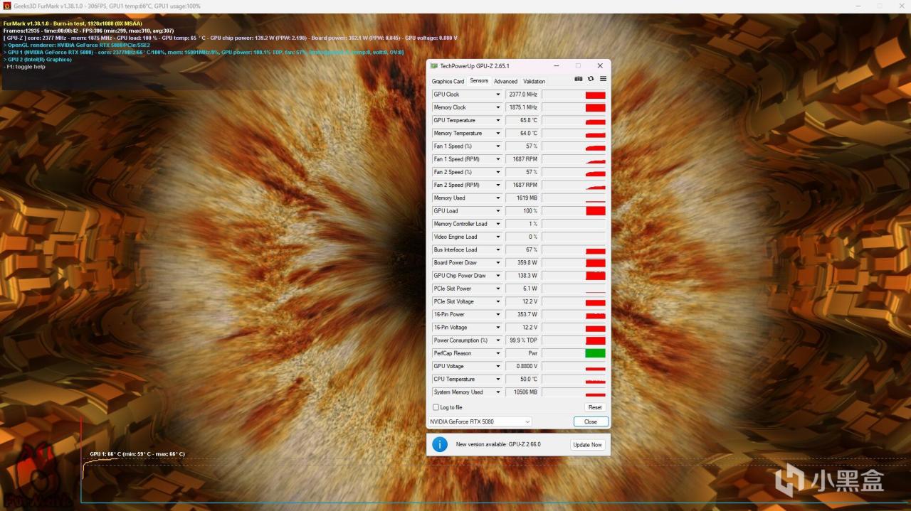 ▼跑個甜甜圈測試,顯卡的PCB功耗在360W左右,TDP直接去到了99.9%,核心溫度65.8℃。