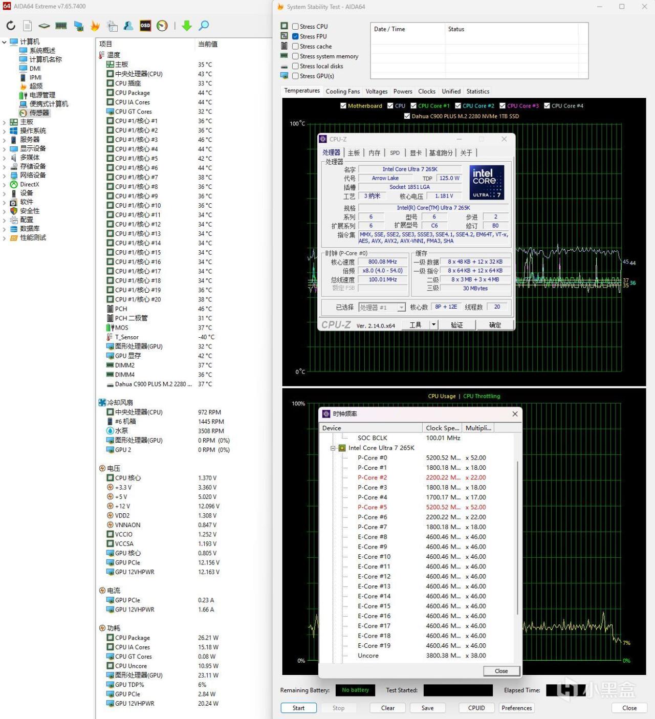▼簡單跑個CPU-Z的壓力測試,處理器功耗在190W左右,大核心睿頻5.2GHz,小核心睿頻4.6GHz,溫度在76℃左右。