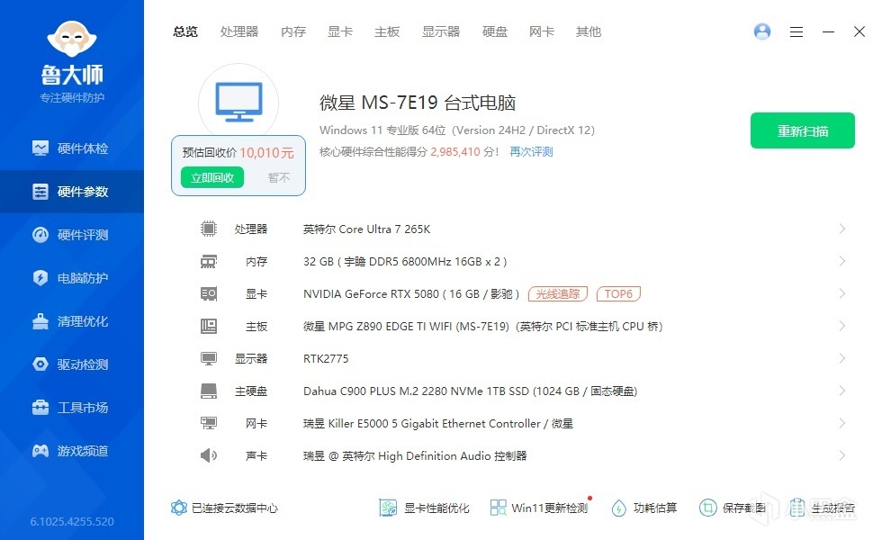 ▼整機配置一覽,處理器是265K,顯卡是RTX 5080,整機硬件很不錯。