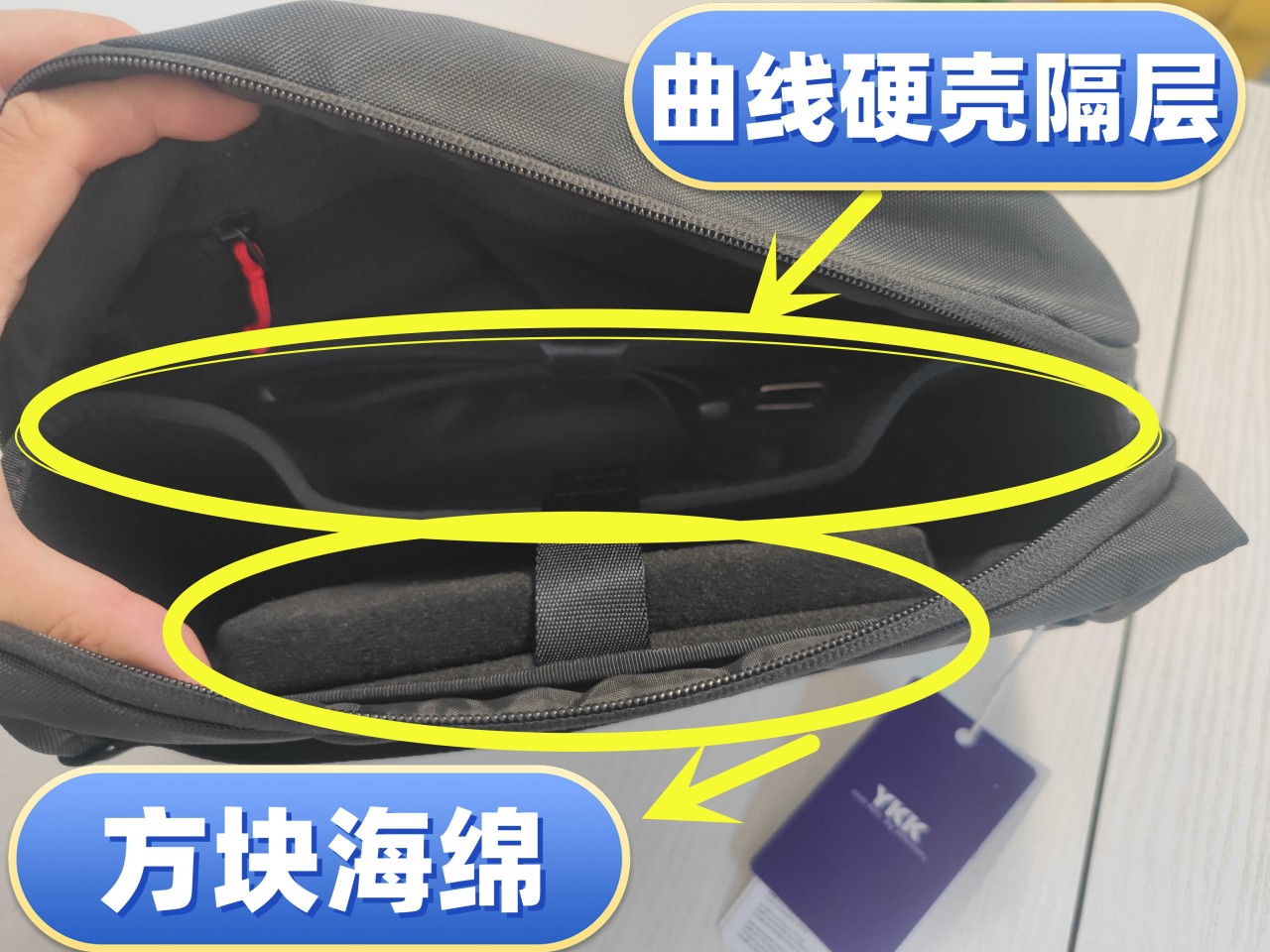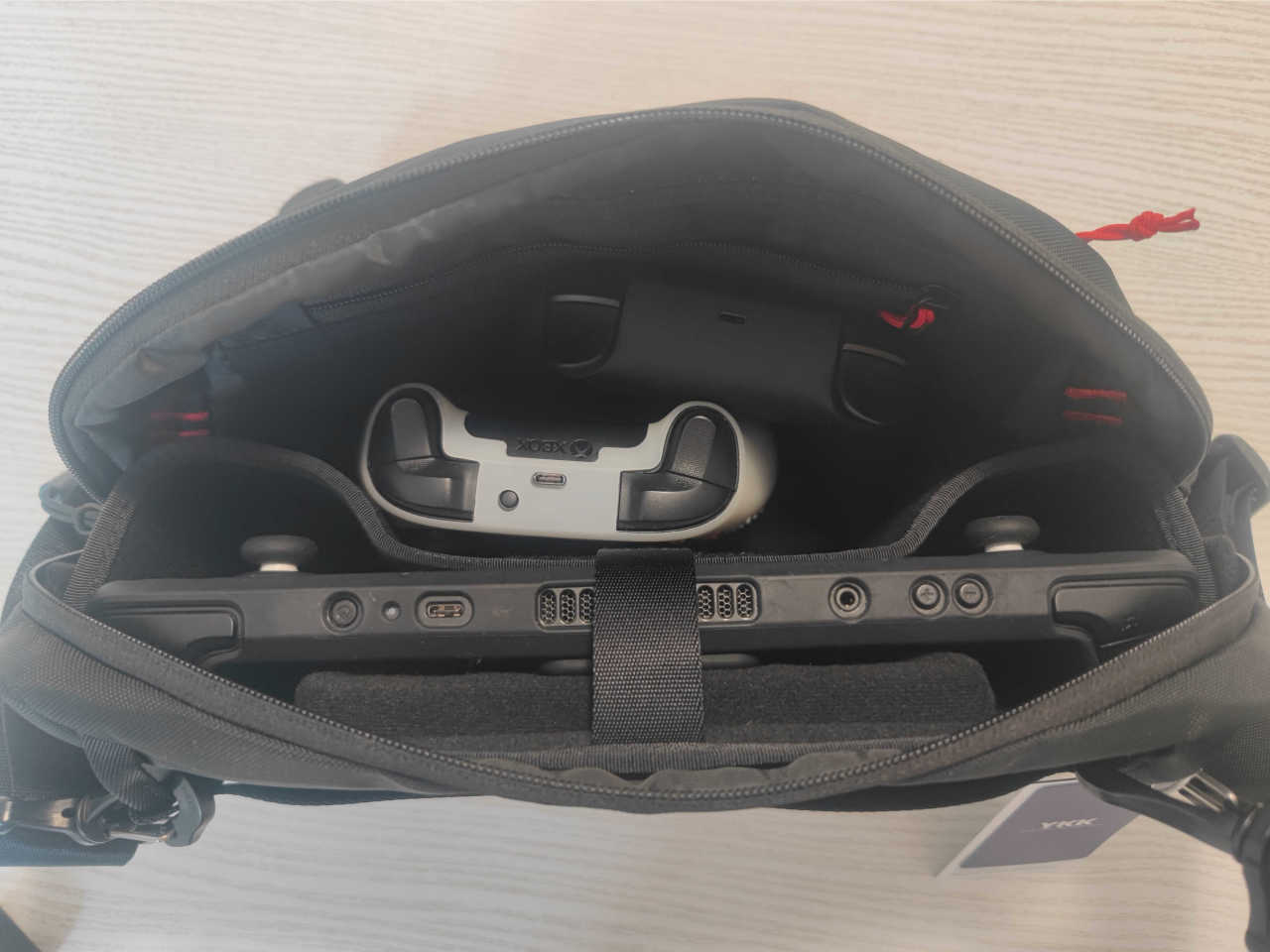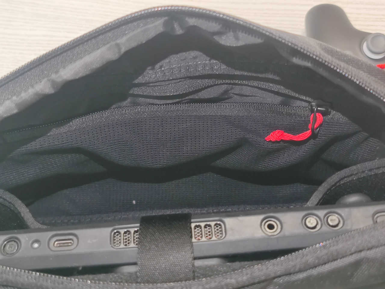 實際打開包的拉鍊,發現裏面有個曲線的硬殼隔層,隔層裏還有方塊海綿凸起,不用問是放掌機的位置。