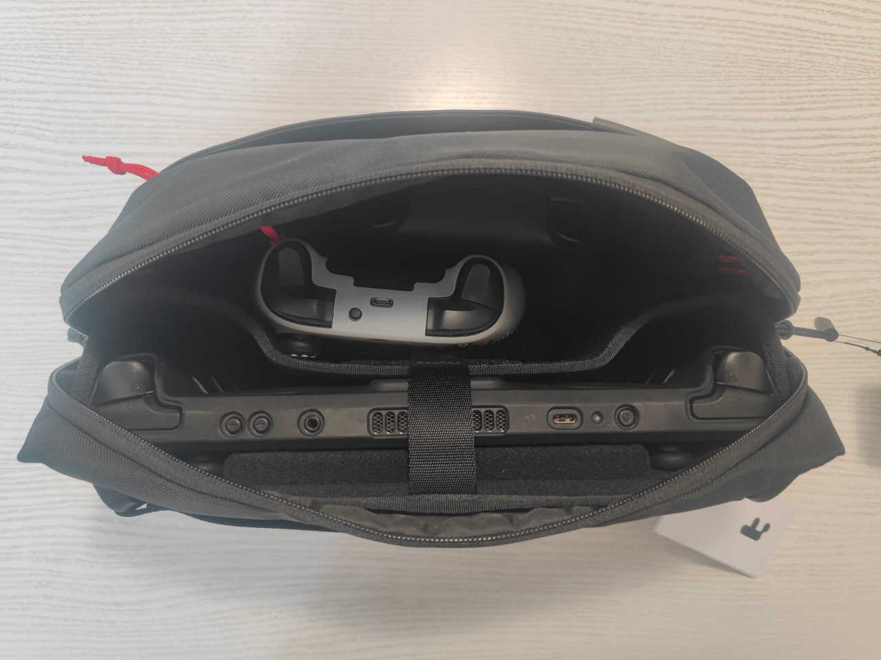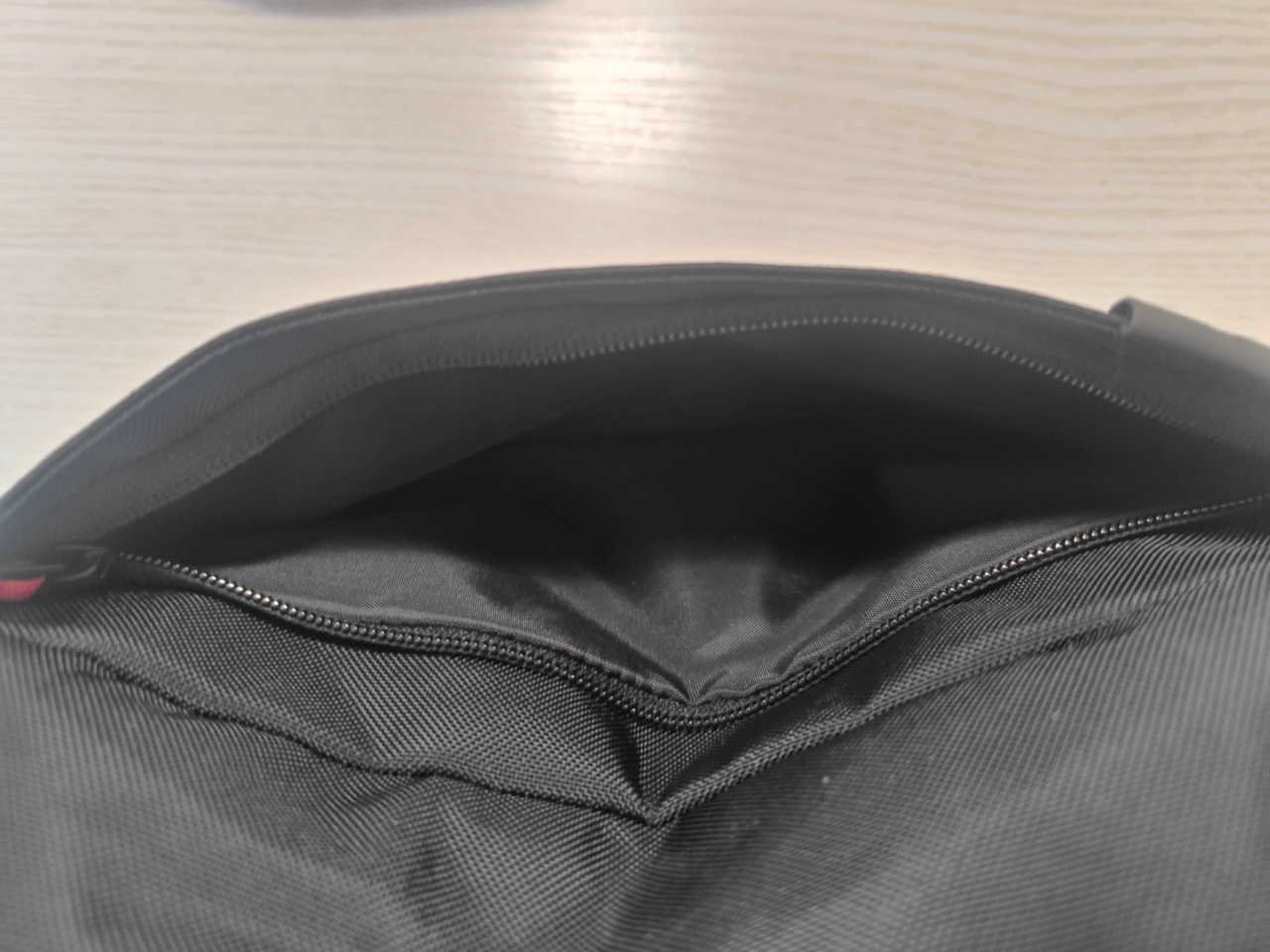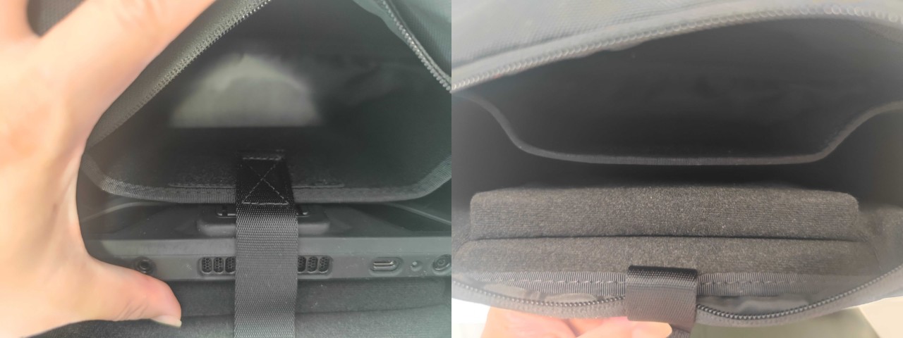 實際打開包的拉鍊,發現裏面有個曲線的硬殼隔層,隔層裏還有方塊海綿凸起,不用問是放掌機的位置。