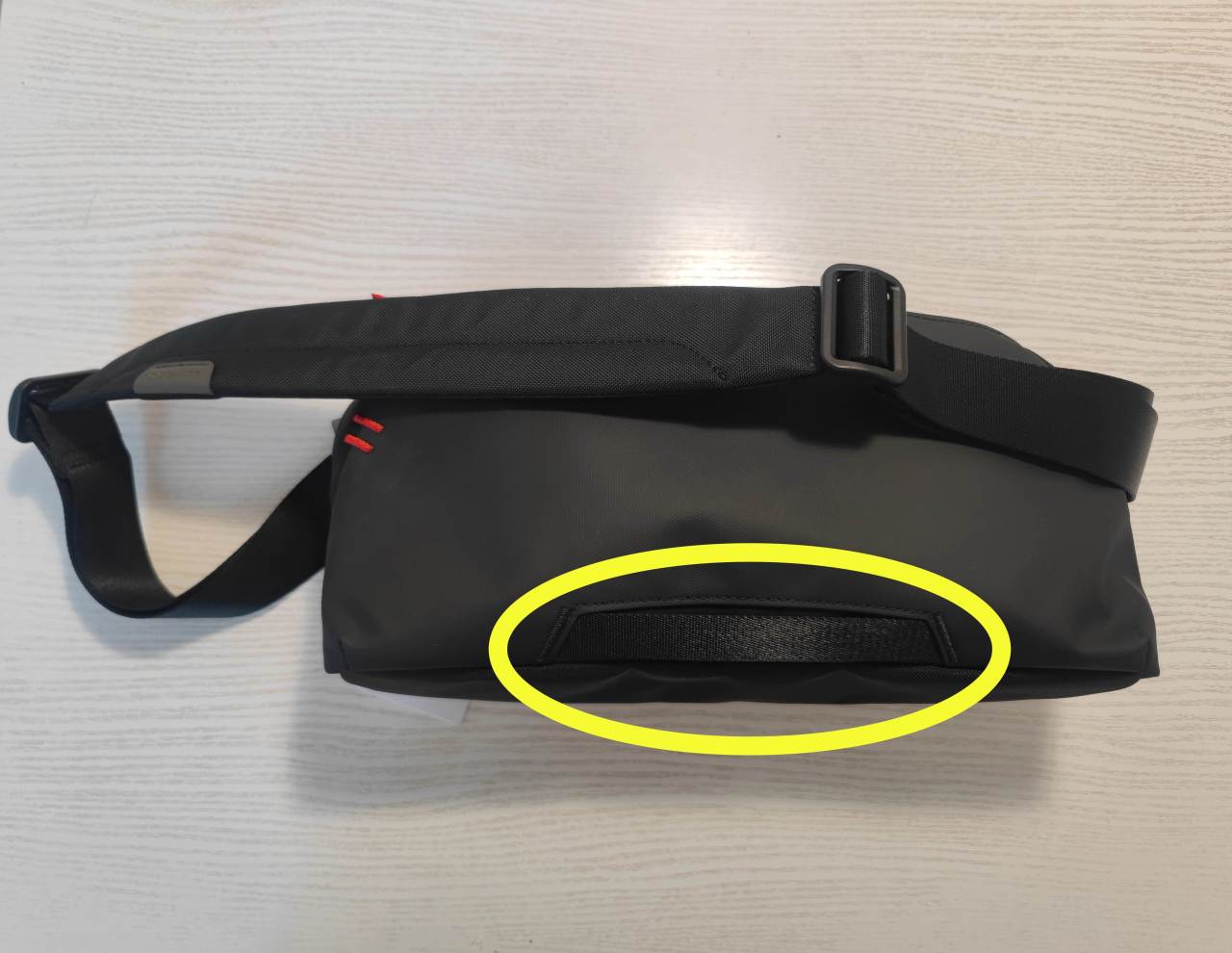 包的正面下方有個提手的帶,我個人認爲設計挺好,可以在揹包在外偶遇特殊情況時,可以手握此處提拽(沒見過世面的我不知道是不是這樣設計的,如有錯也請用包大神指正)