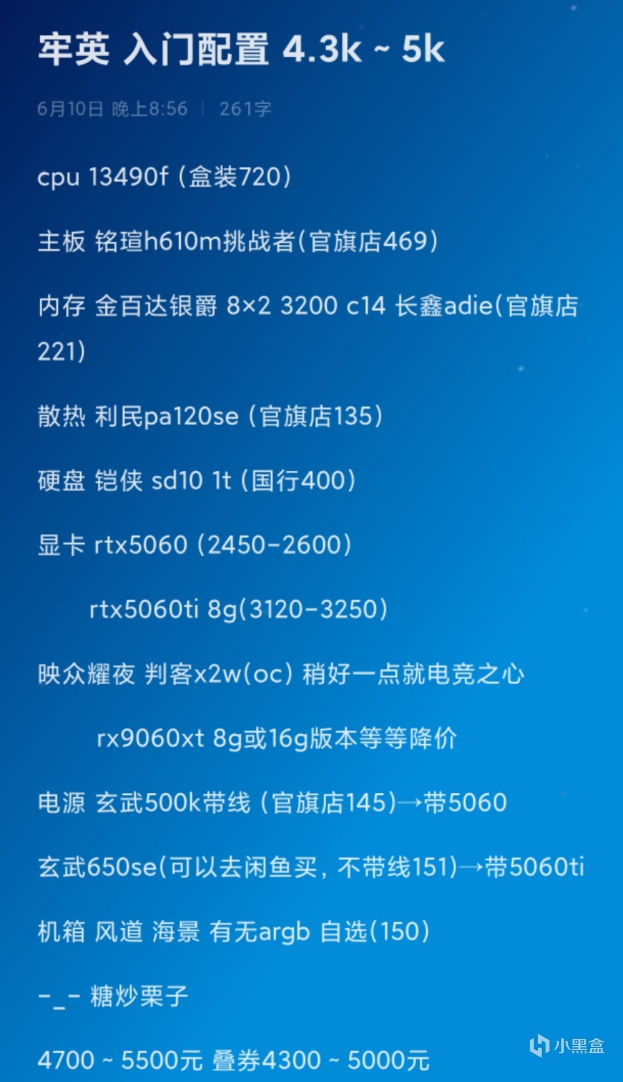本期内容不含争议性配件。显卡,比如据称为入门智检的卡,如rtx3050,rx6500xt等等;及主流消费级i卡,如b580 b570 a770 a580 a380。硬盘像梵想,固德佳等等。当然,懂行的或明确需求的或追求极致性价比的朋友可以自行购买。