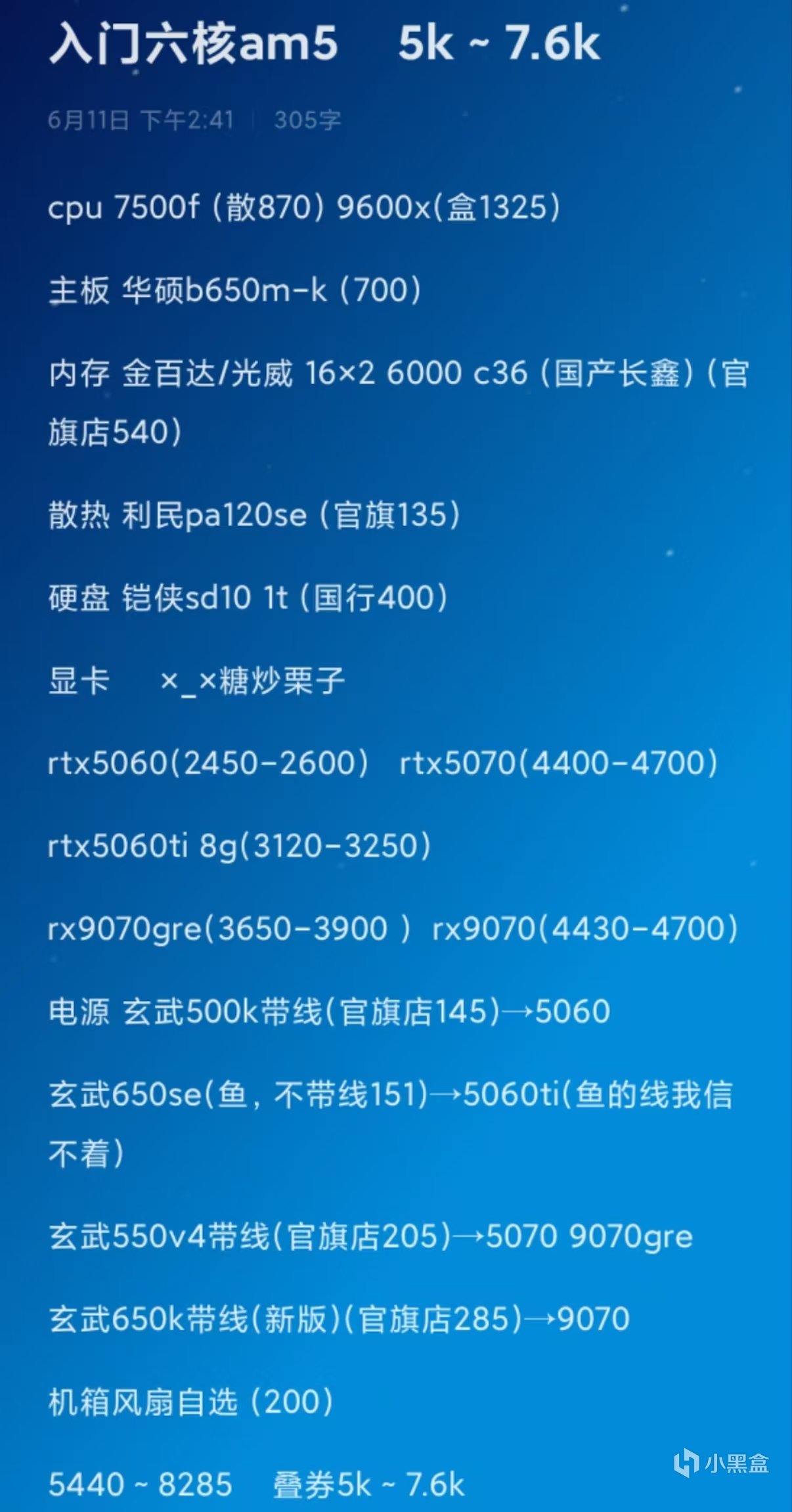 这里的所说的新显卡仅包括n卡50系,a卡9000系及7650gre。部分仍有货的40系及amd6000系7000系因为停产溢价的原因,不在新卡的推荐范围内,你会在二手卡那部分找到他们。在配置单后的碎碎念中,我会列一些无矿的二手的在保卡及其参考价格——鱼近期成交均价。毕竟新卡价格不怎么美丽。