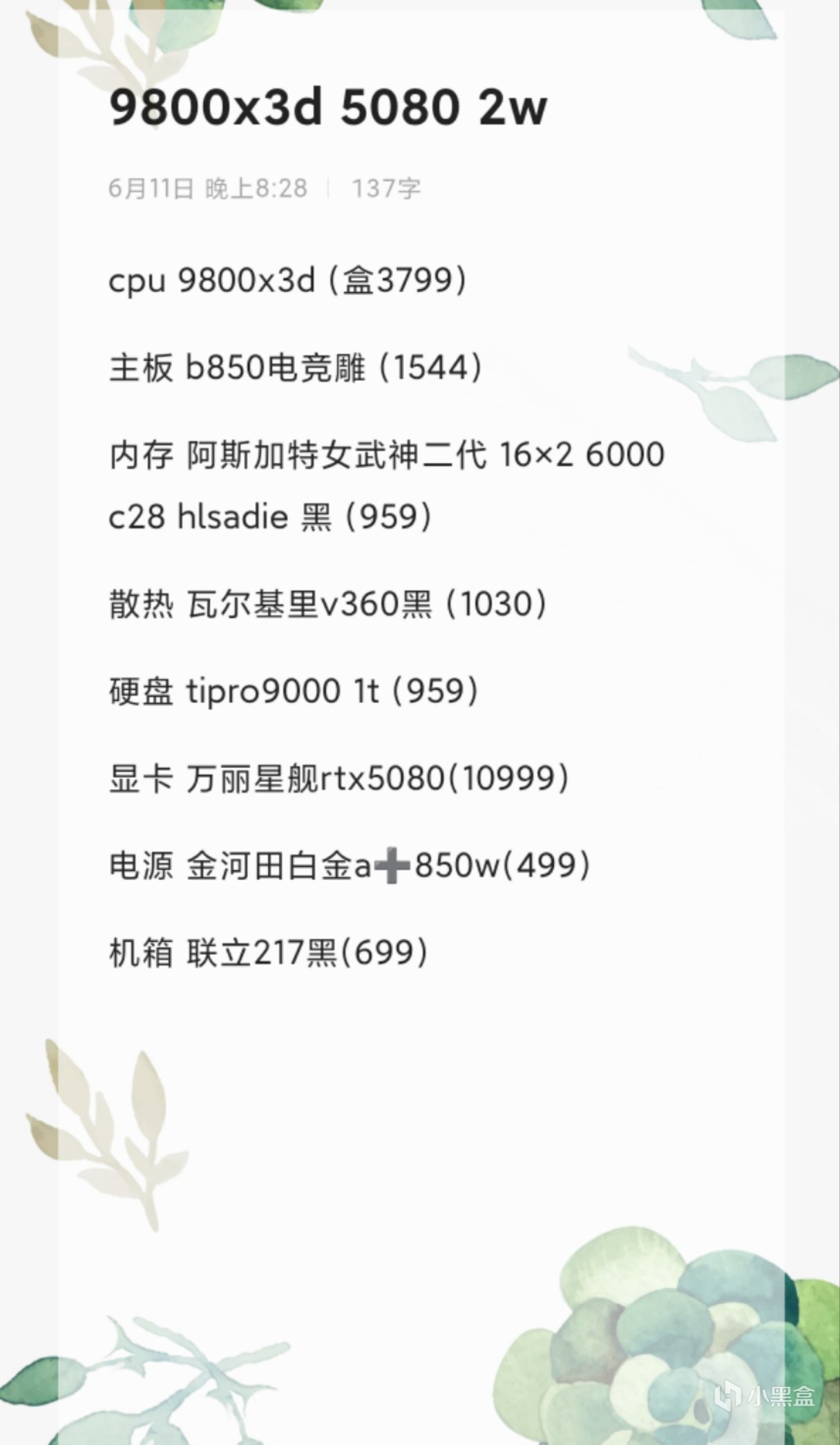 最后是9800x3d+5080的配置单,只有这个全是京东自营的价格: