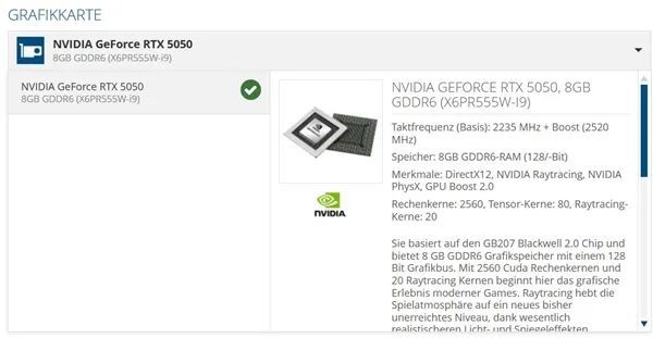 此外,Newegg上架了一款联想Legion 5i游戏笔记本,其RTX 5050显卡则被标注为8GB GDDR7显存。