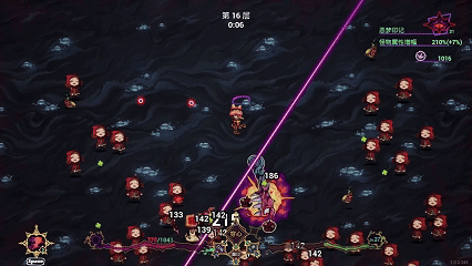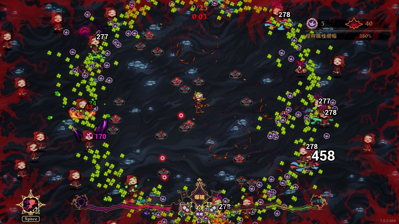主、副和末三把武器,擊中敵人後自動衍生出另兩種武器攻擊,互相彈射滿屏彈幕。構築成型之後,所到之處皆是小紅帽屍體。