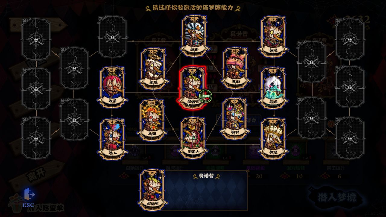 本作的BOSS戰鬥設計與塔羅牌結合,有着獨特的怪物和挑戰規則,翻牌隨機獲得強化獎勵/難題懲罰。成功挑戰後,玩家不僅能獲得關卡內獎勵物品,還將短暫與關卡機制對應的獨有技能。