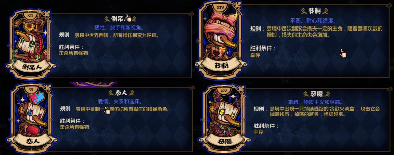 畫面反轉操作逆向的“倒掛”、攻擊火柴盒掉錢但會增加怪物的“惡魔”、鏡像複製玩家角色的“戀人”、翻滾扣血但永久增加血量上限的“節制。”