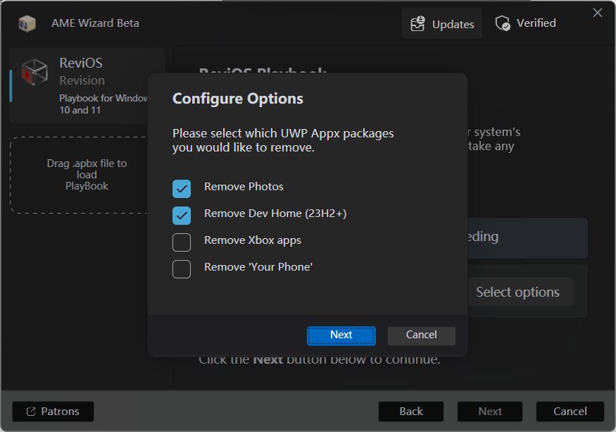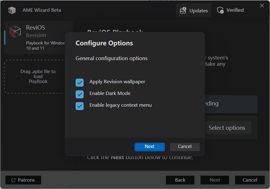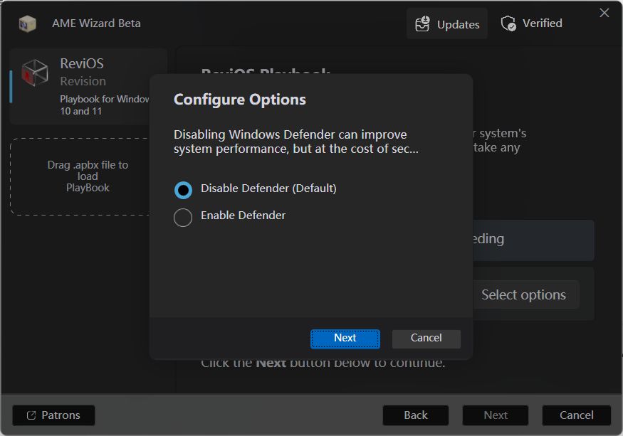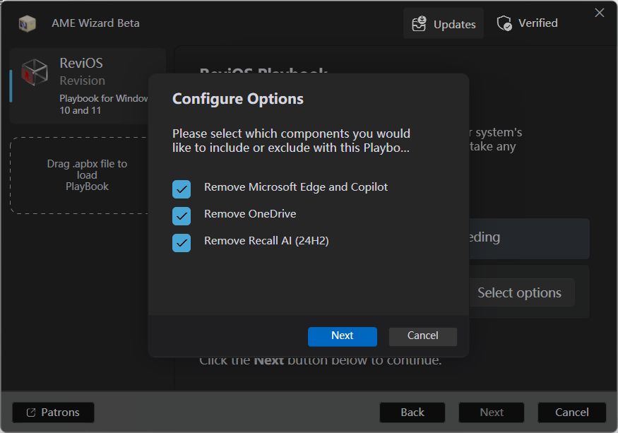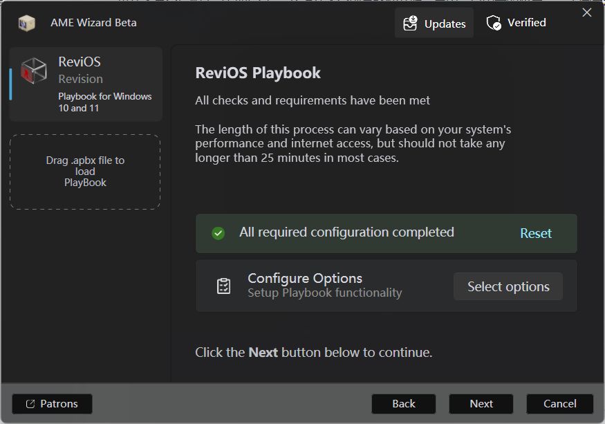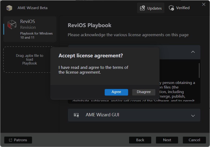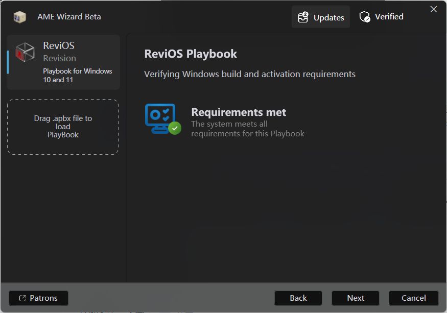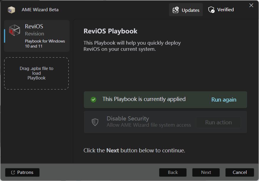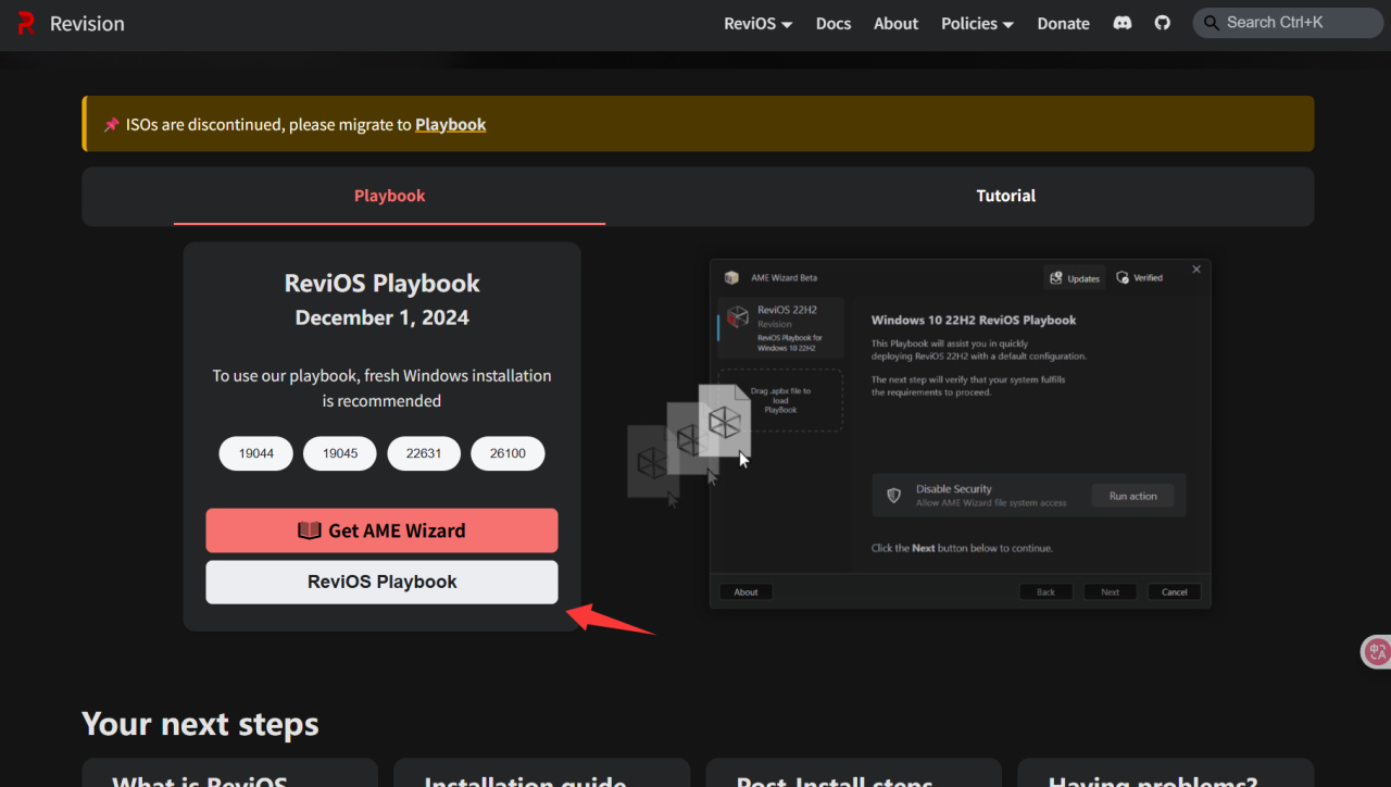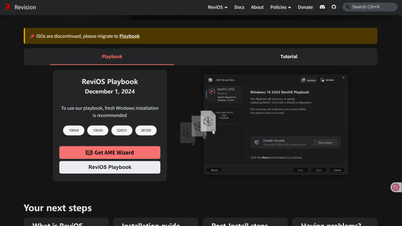 他们目前停止了 ISO 版本的维护,转而发布了 ReviOS Playbook ,本质是一个包含了 Windows 优化方案的小文件,通过开源的 AME Wizard 工具(该工具可以修改正在运行的 Windows 系统),应用来自此 Playbook 的更改。