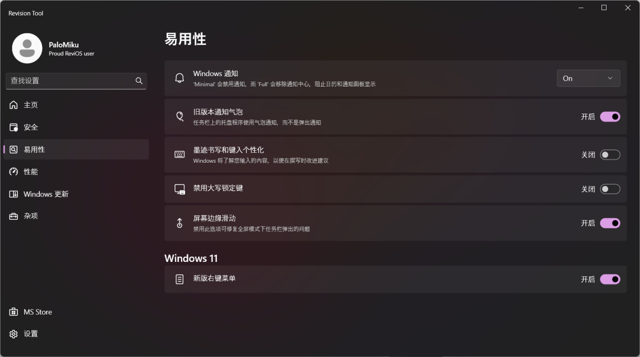 然后是一些全局配置(页面 1 ),从上往下分别是应用 ReviOS 的壁纸,开启深色模式,启用经典二级菜单(也就是 Win10 及以下的鼠标右键后菜单)