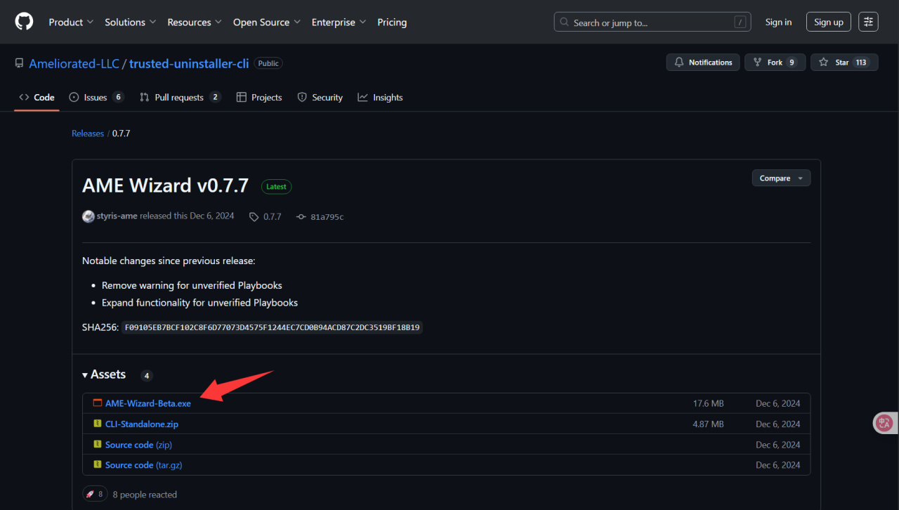 我们选择并下载“AME-Wizard-Beta.exe”,如果你打不开 Github 可以自行安装 Watt toolkit 对其进行加速。