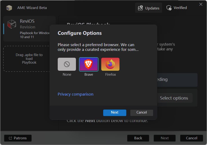 在下个页面我们将正式开始优化安装,首先它会提示你是否需要安装自由的浏览器,我们可以选择 Brave 或者 Firefox ,也可以选择 None 不安装。